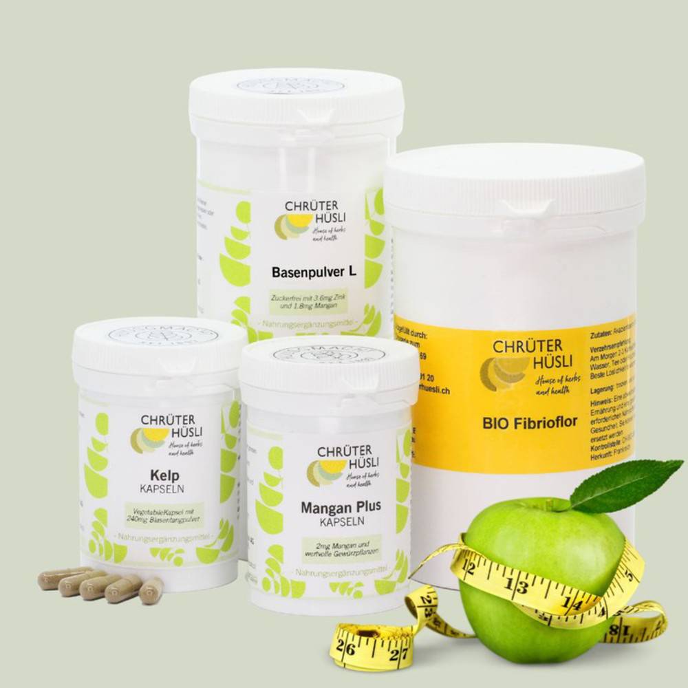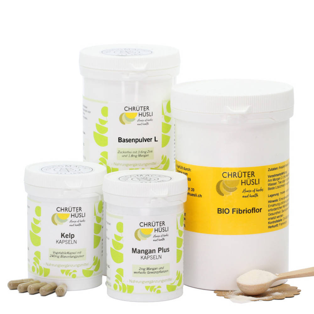 100 Kelp Kapseln: 240mg Kelp Pulver (Fucus vesiculosus PHEUR), vegetabile Kapsel (Hydroxypropylmethylcellulose) 100 Mangan plus Kapseln: Moringablätter, Ingwerwurzel, schwarzer Pfeffer, Cubebenpfeffer, Cayennepfeffer; Mangangluconat, Eisengluconat, Zinkbisglycinat, Kupfergluconat, Chromhefe, Magnesiumstearat, vegetabile Kapsel (Hydroxypropylmethylcellulose) 200g Basenpulver Laktosefrei: Kalziumcitrat, Kaliumcitrat, Doppelkohlensaures Natrium, Magnesiumgluconat, Zitronensäure, Akazienfasern Bio*, Zinkbisglycinat-Zellulose, Mangangluconat, Fenchelpulver, Yuzu Pulver 200g Fibrioflor BIO: Akazienfasern Bio (≥90% Faseranteil) *Kontrollstelle: CH-BIO-006