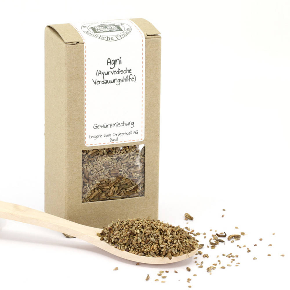 Agni - das individuelle Verdauungsfeuer. Agni spielt im gesamten Veda eine wichtige Rolle. Mit dem Wort Agni beginnt der Veda, es ist der Intelligenzimpuls des Bewusstseins. Aus diesem Impuls geht die ganze Schöpfung hervor: "Und Gott sprach: Es werde Licht und es ward Licht!" Aus dieser ersten feinen Schwingung heraus erschafft und erneuert unsere innere Intelligenz täglich unseren Körper. Das kosmische Feuer wird zum Verdauungsfeuer, das überall in unserem Geist-Körper-System wirkt. Agni steuert nicht nur die Verdauungstätigkeit innerhalb des Magen-Darm-Trakts, sondern reguliert gleichzeitig den gesamten Stoffwechsel bis hin zur Transformation unserer Nahrungsbestandteile. Ein Mensch mit einer guten Assimilations- und Stoffwechselleistung kann Nahrung gut verwerten und Eindringliche von aussen wirkungsvoll bekämpfen, er ist kräftig, gesund und energievoll und bleibt vital bis ins hohe Alter. Der sorgsame Umgang mit Agni gehört zu den wichtigsten Regeln der ayurvedischen Heilkunst. Unterstützt werden kann die Stärkung von Agni durch verdauungsfördernde und stoffwechselanregende Gewürze, wie sie in dieser ausgewogenen Gewürzmischung sinnvoll zusammengestellt sind. Die bewährte ayurvedische Rezeptur (Verdauungshilfe), soll vor dem Gebrauch bzw. Einsetzen, mit dem Mörser leicht zerrieben werden.
