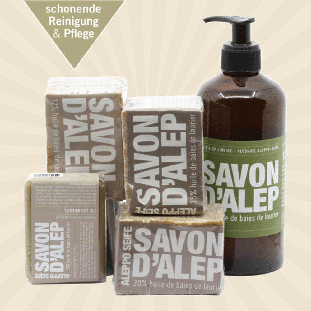 Pflegeseife für Körper und Gesicht - hergestellt über dem Feuer in Aleppo. Nutzen Sie zur Reinigung Ihrer Hände, Ihres Körpers und der Haare eine natürliche Seife mit Olivenöl und dem wertvollen ätherischen Öl der Lorbeerfrüchte. Dieses hat nicht nur eine gründlich reinigenden Charakter, sondern verleiht der Seife auch ihre erfrischenden, stimulierenden und hautstärkenden Eigenschaften. Vor 4000 Jahren wurde in der syrischen Stadt Aleppo, die erste von Menschen produzierte Seife hergestellt. Die Aleppo-Seife! Heute wird die traditionelle Seife von erfahrenen Seifenproduzenten in Aleppo hergestellt. Deren Herstellung ist 100% natürlich und die Grundsubstanzen sind gänzlich abbaubar . Die Seife enthält keine tierischen Fette und wurde nicht an Tieren getestet . Das verwendete Olivenöl aus zweiter Kaltpressung reinigt und nährt die Haut ohne sie zu reizen. Dank der Milde der Seife ist sie ideal auch für den Intimbereich . Sie bekommt allen empfindlichen Hauttypen und ist dermatologisch getestet.