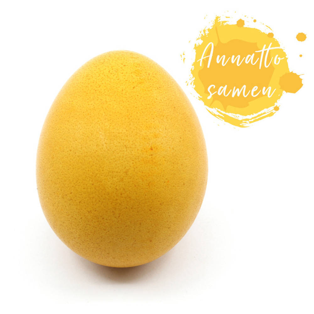 Mit der natürlichen Ostereierfarbe Annattosamen färben Sie Ihre Ostereier wunderschön goldgelb ! Der Annattostrauch (Bixa orellana) wächst in Südamerika, der Karibik und Südostasien. Die Samen sind klein, rot und dreieckig und können sowohl zum Färben, als auch zum Würzen verwendet werden. Als Lebensmittelfarbe E160b wird Annatto zum Färben von Käse (Cheddar, Mimolette) verwendet. Als Gewürz passt Annatto zu Geflügel, in Chili con Carne, Gulasch sowie in Schmorgerichte und Reistöpfe. Die getrockneten Samen schmecken erdig, herb und kurkumaähnlich.