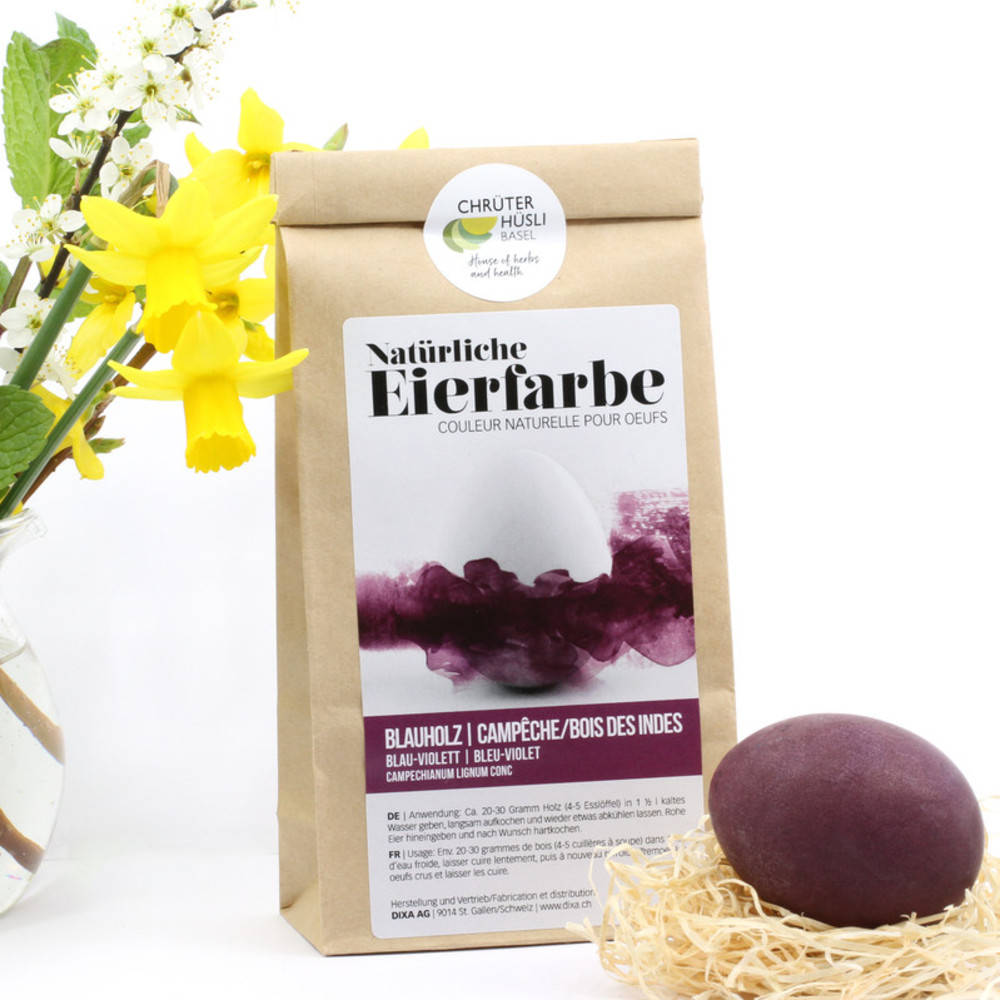 Max. 4 EL Blauholz (20g) in 1.5 lt. kaltes Wasser geben und aufkochen. 10 Min. weiterkochen. Sud absieben und die rohen Eier im dunklen Farbsud während der gewünschten Zeit hart kochen. Vorbehandlung der Eier mit Essig ratsam.