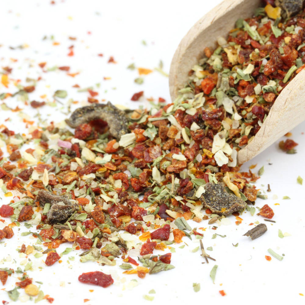 Ein wahrer Traum! Dieses herrliche Brotgewürz passt nicht nur zu Focaccia, Fladenbrot oder Pizzabrot, sondern verzaubert auch Antipasti, gedämpftes Gemüse und Salate in einen italienischen Leckerbissen. Für alle, die einen Hauch Italien zu sich nach Hause holen wollen! Wir lieben es! Chrüterhüslis Focaccia Rezept-Tipp: 500g Pizza-Mehl und 2 KL Salz mischen. 20g Frischhefe mit 3dl lauwarmen Wasser mischen. Alles zusammen mit 4 EL Olivenöl und 2 EL Focaccia Gewürzmischung vermischen und gut durchkneten. Zugedeckt an einem warmen Ort 1.5 Stunden gehen lassen. Teig auf wenig Mehl 2cm dick auswallen. Auf Backpapier und Blech legen. Mit den Fingern Vertiefungen eindrücken, mit 2 EL Olivenöl bestreichen und etwas Fleur de Sel bestreuen. 20 Minuten im vorgeheizten Backofen bei 220 Grad Celcius backen.