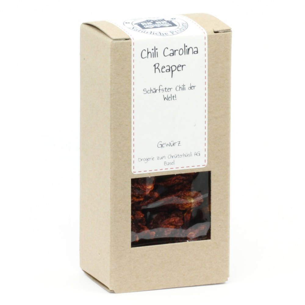Die schärfste Chili der Welt! Eine moderne Super-Hot-Züchtung von Ed Currie aus dem US-Bundesstaat South Carolina, bei der Vorsicht oberstes Gebot ist! Zwar sind die Elternteile nicht genau bekannt, jedoch geht man von einer Kreuzung der karibischen Habanero und der pakistanischen Naga -Chili-Variante aus. Laut dem Guiness-Buch gilt Carolina Reaper seit 2013 als schärfste Chili der Welt und weisst 2'2000’000 Scoville Units auf. Carolina-Chili ist etwa zweimal schärfer als " Jays Ghost-Chili " oder " Bhut Jolokia Chili " Die leuchtend roten, pflaumengrossen und verschrumpelten Schoten tragen einen typischen, auffälligen Stachel, der uns vielleicht vor der gnadenlos zubeissenden Schärfe warnen soll. Der Carolina Reaper Chili hat anfänglich kirschenartige und zimtähnliche Noten bevor die unerbittliche Schärfeexplosion klirrend und langanhaltend dominiert. Die direkte Beigabe in Essen ist nicht empfehlenswert. Idealerweise verwenden Sie Carolina Reaper als Zutat in Saucen und Salsas. GANZE CHILISCHOTEN: Die ganzen, getrockneten Chili-Schoten während 30 Minuten in warmes Wasser einlegen. Anschliessend abtropfen lassen und Schneiden. ***Carolina Reaper darf nur von geübten Chili-Essern vespeist werden.***