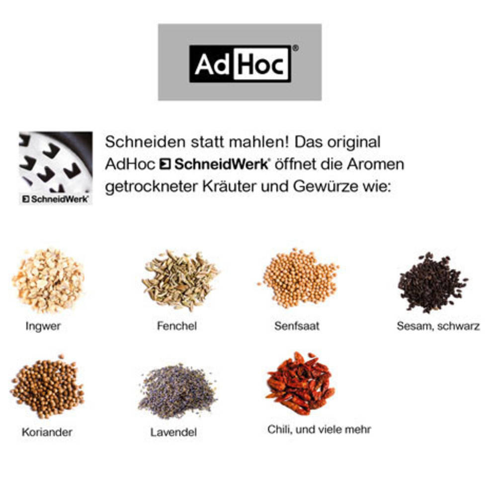 Der platzsparende Gewürz- und Chili-Schneider für zu Hause und unterwegs! Damit sich die Aromen von Kräutern, Gewürzen und Chilis so richtig entfalten können, ist die richtige Anwendung entscheidend. Hierfür hat AdHoc ein patentiertes SchneidWerk® entwickelt, das durch seine geätzten, messerscharfen Zähne die Gewürze feinst zerschneidet, anstatt sie zu mahlen. So entstehen völlig neue Genusserlebnisse! Der Mini Chili- und Gewürz-Schneider "Voyage" eignet sich als Einsteigermodell für Genussliebhaber*innen oder als edles Geschenk, zusammen mit Gewürzen wie Chilis, Cardamom, Koriander, Ingwer, Anis und vielen anderen. Er ist ein innovatives Lifestyle-Produkt für die Küche und den Tisch, der gleichzeitig höchste Anforderungen an Funktion, Ästhetik und Qualität verbindet.