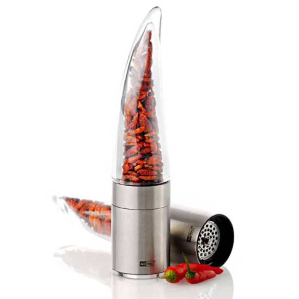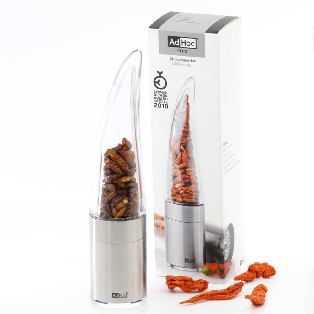 Die individuelle Gestaltung lässt sofort die Funktion erkennen: „For Chilies only!“ Das elegante Acryl-Edelstahl-Design, für den freien Blick auf die Chilis, macht PEPE zum echten Eye-Catcher auf dem Tisch. PEPE verfügt über das patentgeschützte original AdHoc SchneidWerk®, das für das optimale Zerkleinern von getrockneten Chilis samt Kerne ausgerichtet ist. Durch die feine Dosierung führt der Umgang mit Chilis zu keinen unliebsamen Überraschungen mehr. Die Aromaschutzkappe sorgt dafür, dass das geschnittene Chilipulver letztendlich nur dahin kommt, wo Sie es wirklich hin haben möchten, nämlich auf die zu würzende Speise. 2018 erhält PEPE den German Design Award mit der Auszeichnung „Special Mention“. 2010 wurde der Chilischneider bereits mit dem Home Style Award in der Kategorie „Best Look“ ausgezeichnet. Die Wahl erfolgte über eine öffentliche Abstimmung durch Endverbraucher im Internet über einen Zeitraum von 5 Monaten und über eine internationale Jury.