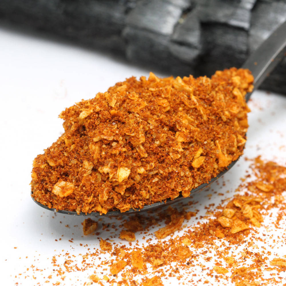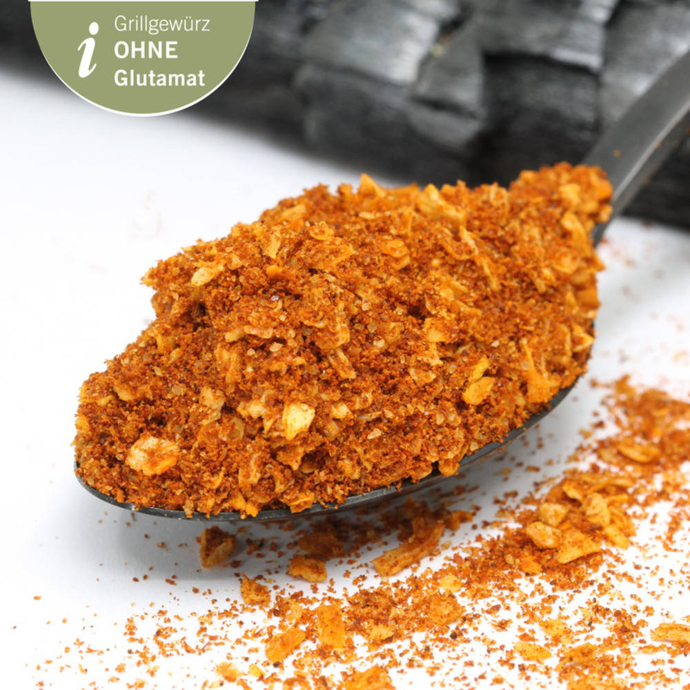 Ancho Chili, Piment, geräucherter Paprika, Koriander, Zwiebel, Knoblauch, Petersilie, Kreuzkümmel, Senf körner, Pfeffer, Kümmel, Liebstöckel, Thymian, Majoran, Oregano, Basilikum, Kerbel, Estragon, Steinsalz, geräuchertes Meersalz, Rohrohrzucker.