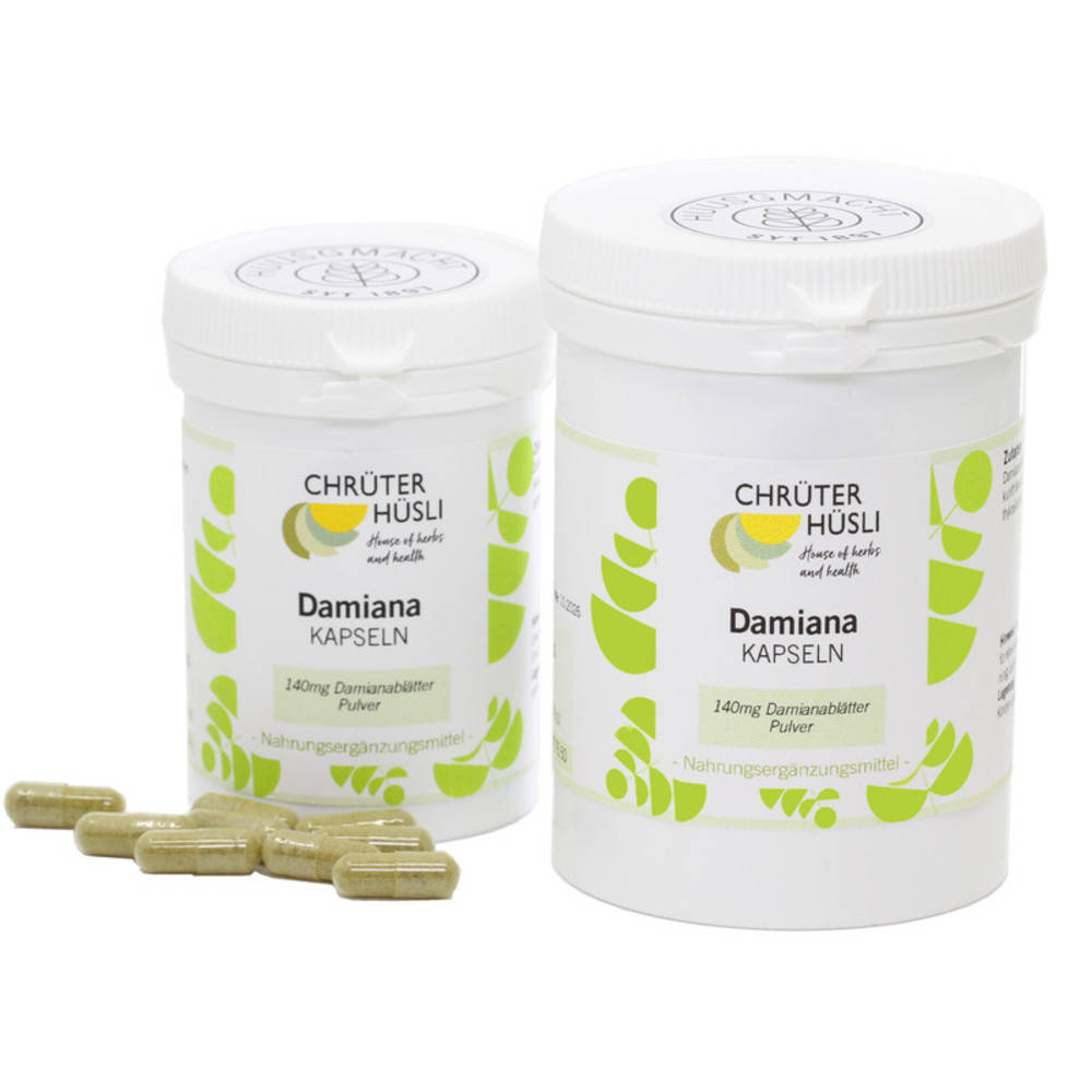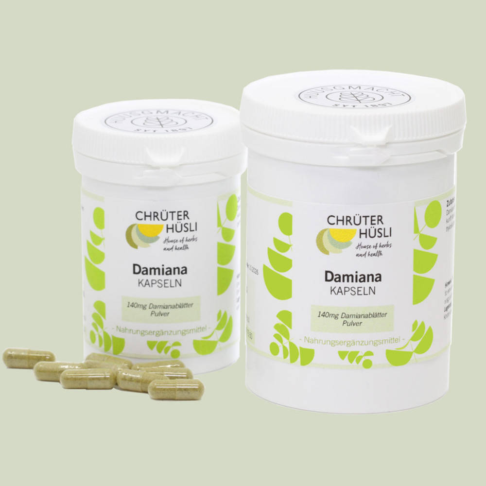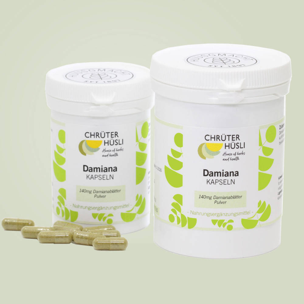 Hausgemachtes Nahrungsergänzungsmittel mit reinem Pulver des Damianablattes. BOTANIK | GESCHICHTE Der botanische Name ist Turnera diffusa. Damiana ist ein 1-2 Meter hoher, vielfach verzweigter Strauch mit kleinen, gelben Blüten. Von Südkalifornien bis Argentinien ist diese blühende Blattpflanze in waldigen, felsigen und trockenen Gebieten zu finden. In Mexiko wird sie in grösserer Menge angebaut, weshalb sie dort auch häufig anzutreffen ist. Es wird vermutet, dass bereits die Mayas Damiana als Heilpflanze zum Erhalt der natürlichen physischen Kräfte, verwendet haben. Seinen Namen erhielt der Strauch im 17. Jahrhundert von spanischen Missionaren. In Anlehnung an den heiligen Damian, den Schutzpatron aller Apotheker, nannten sie den Strauch Damiana. Synonyme : Schäferkraut (hierba del pastor), Asthmabesen, Hemdauszieher