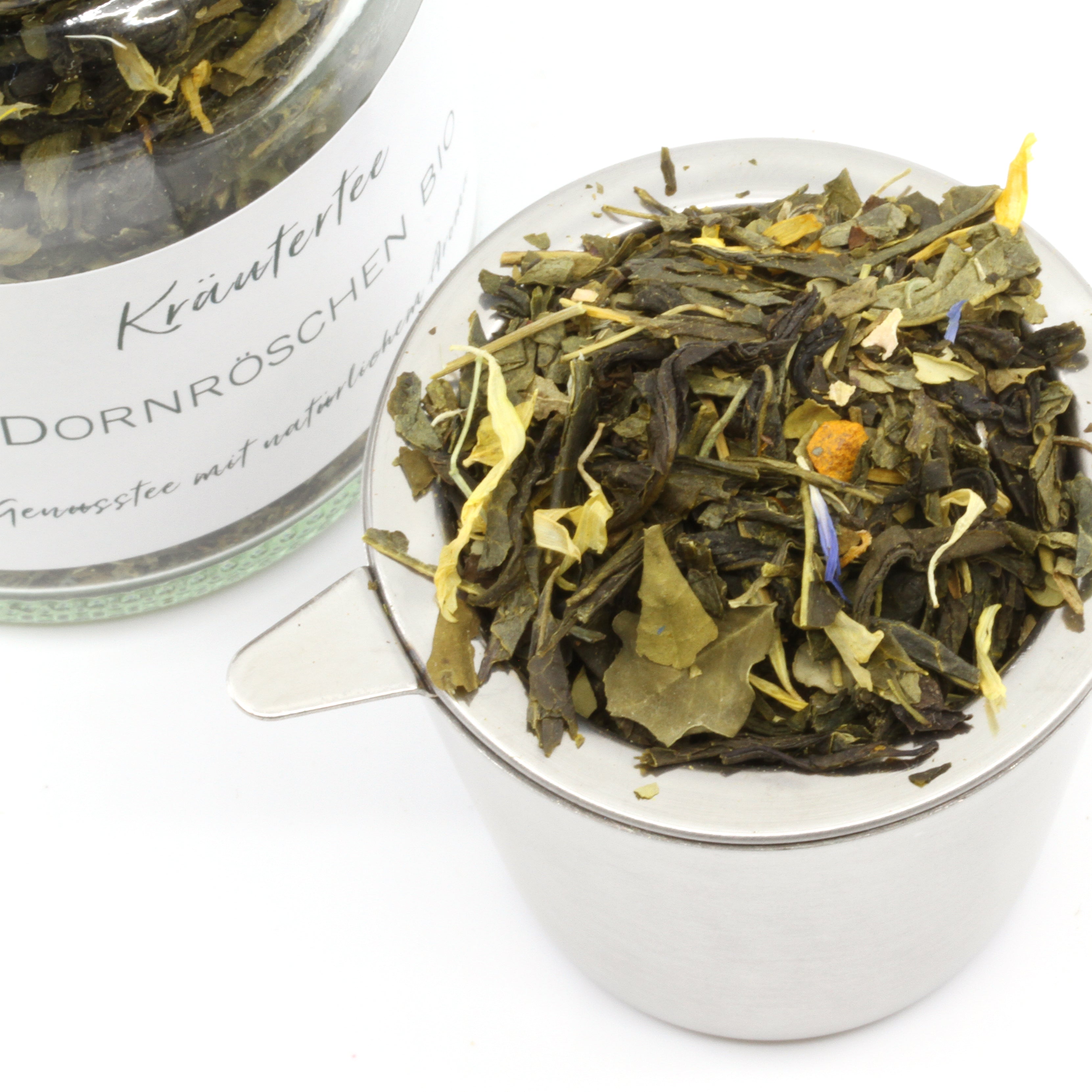 Der Dornröschen Tee Bio ist eine feine, blumig-frische Grünteemischung mit sanfter Süsse und floralen Noten. Grüner Tee bildet die leichte Basis, ergänzt durch Moringablätter, Melisse und Kurkuma. Rosen-, Ringelblumen- und Kornblumenblüten verleihen dem Tee sein märchenhaftes Aroma, während natürliche Lychee- und Rosennoten für eine elegante, harmonische Abrundung sorgen.