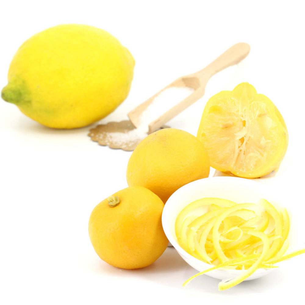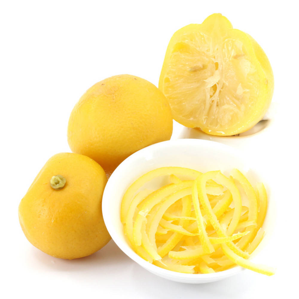 Zitrone aufschneiden, Fruchtfleisch entfernen und die Schale fein hacken. Gehackte Schale unter das Gericht oder Dressing mischen.