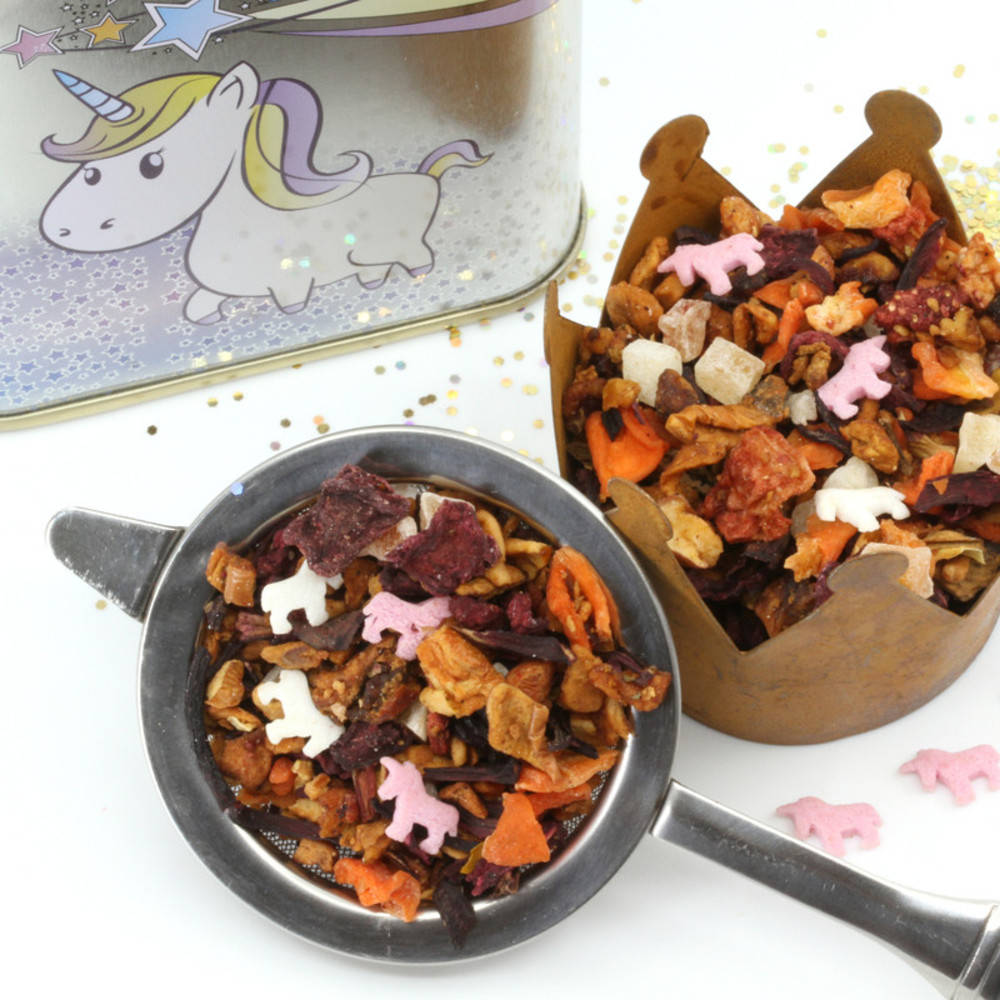 Unser " Einhorn Zauber Tee " enthält Zucker-Einhörner und kommt gänzlich ohne synthetische Farb- und Duftstoffe aus! Ein Geschenk mit Garantie-Erfolg bei kleinen Mädchen!