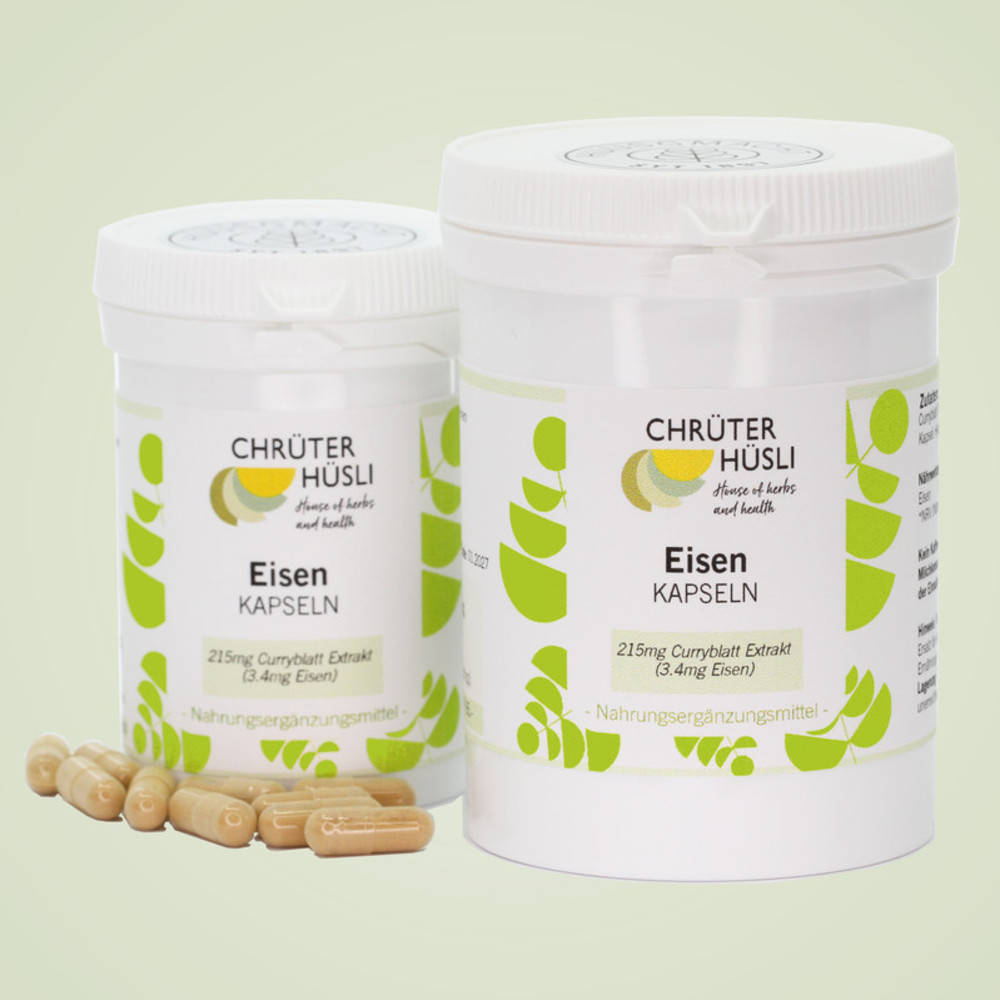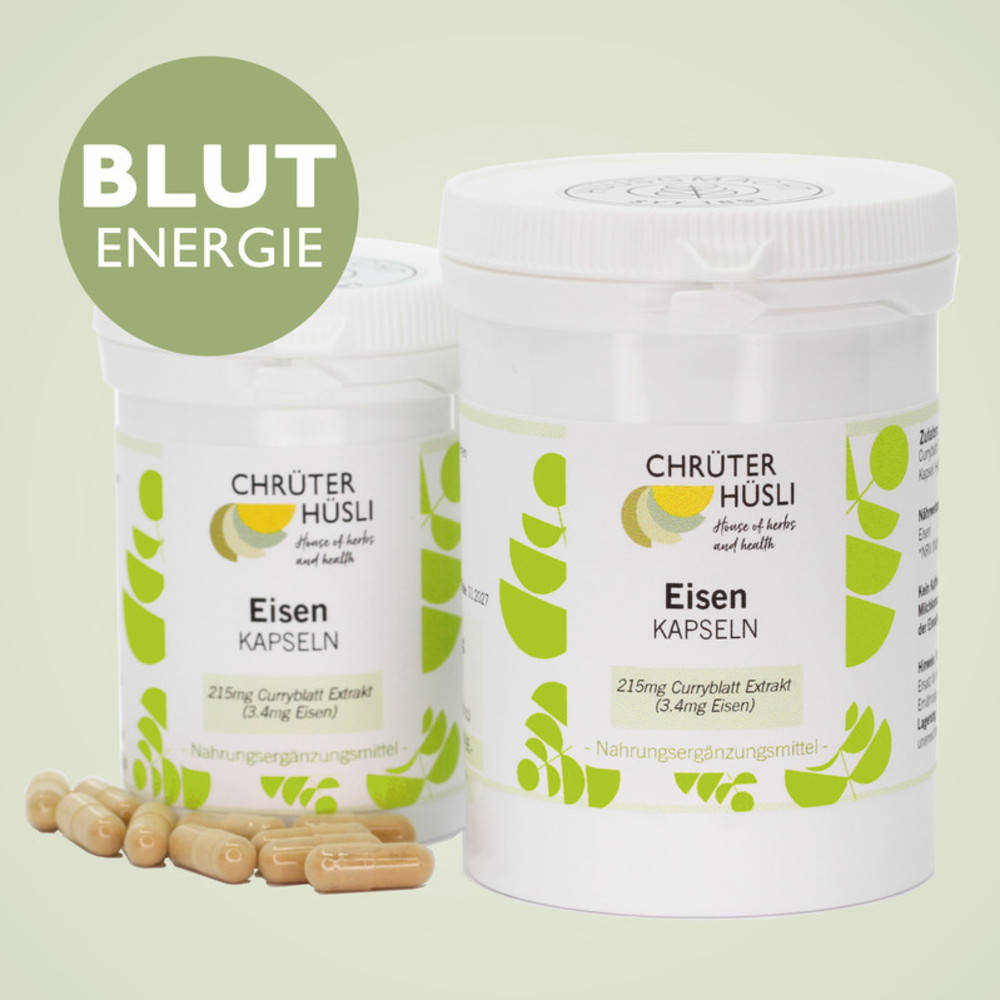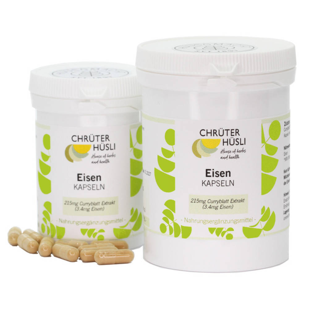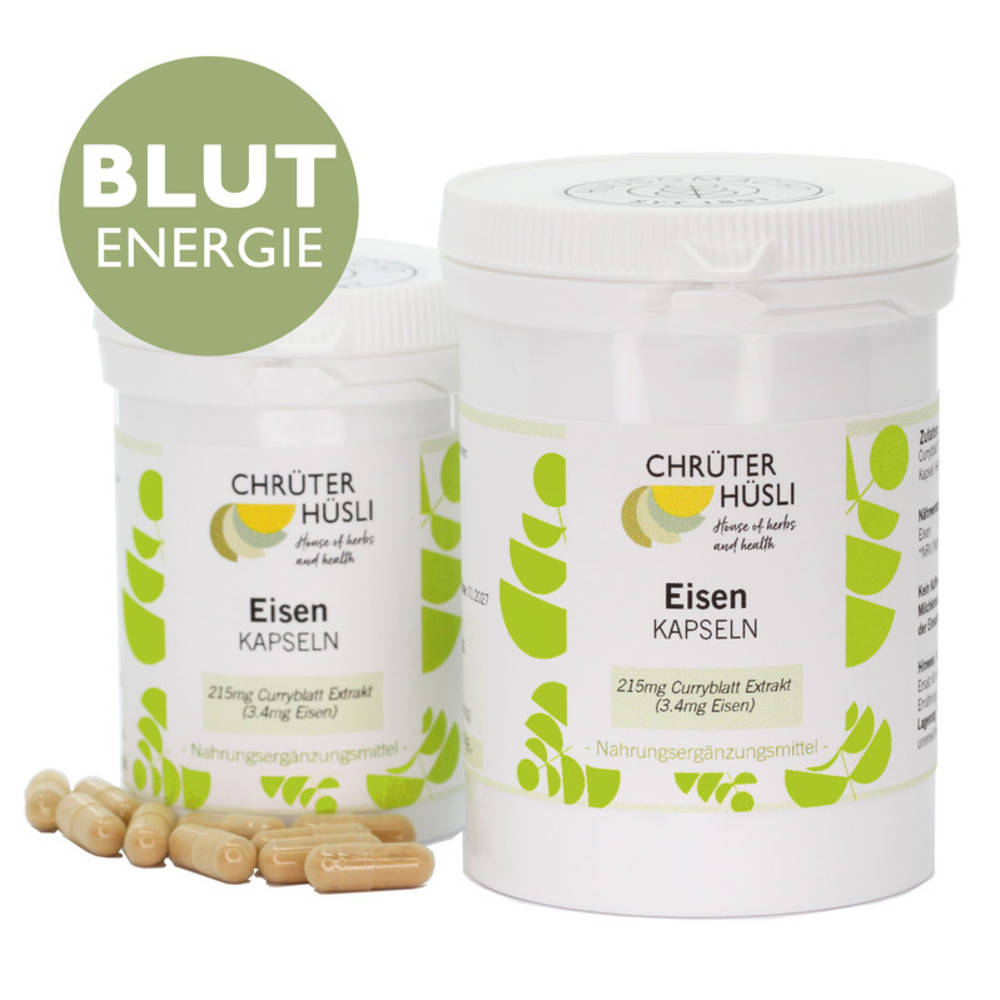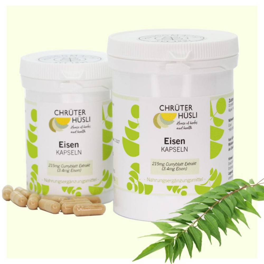 215mg Curryblatt Trockenextrakt, davon 3.4mg reines Eisen entsprechend der empfohlenen Tagesmenge; Kapsel: Hydroxypropyl-methylcellulose.
