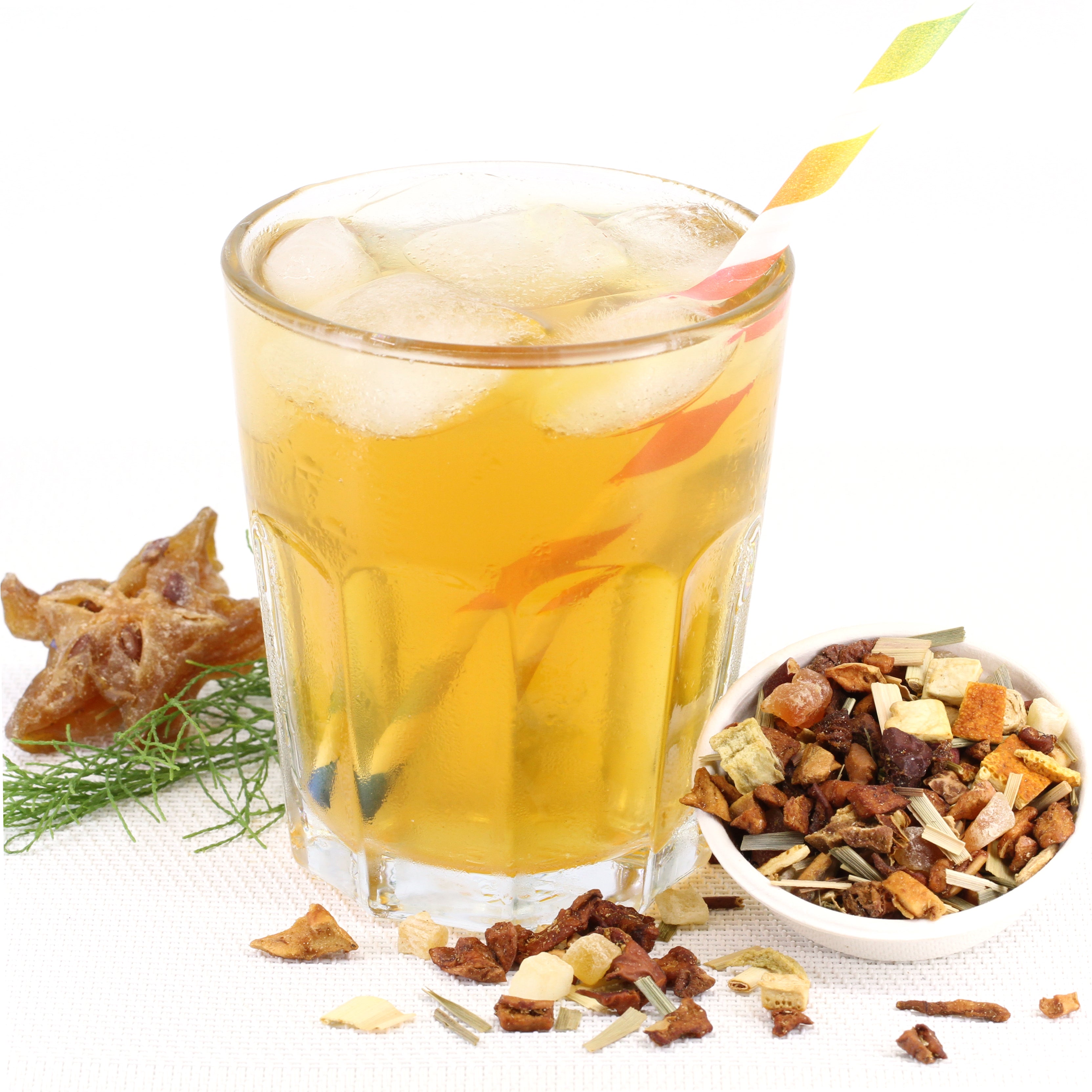 Der Eistee Australischer ist eine fruchtig-exotische Teemischung, speziell entwickelt für die Zubereitung als erfrischender Eistee. Apfel, Birne und Zitrusnoten treffen auf kandierte Ananas und Sternfrucht, begleitet von Ingwer und Lemongras. Kiwi- und Sternfruchtaromen verleihen dem Tee eine lebendige, tropische Frische mit ausgewogener Süsse.