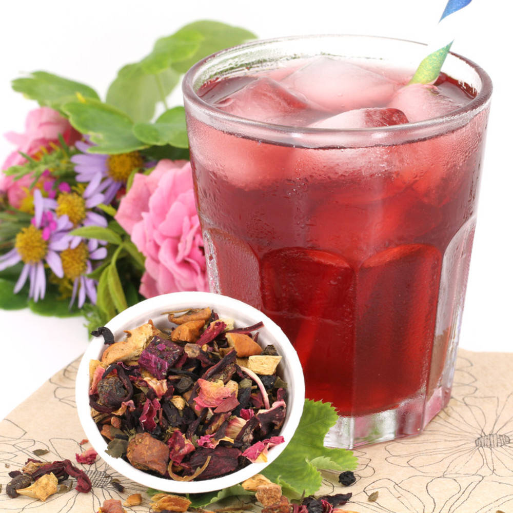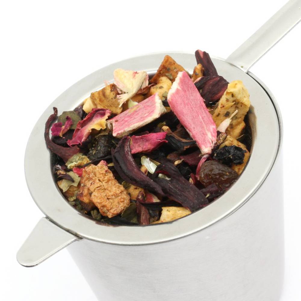 Apfelstücke, Zitronensäure, Hibiskusblüten, Weinbeeren, süsse Brombeerblätter, Holunderbeeren, Drachenfruchtstücke, Rosenblütenblätter, Rhabarberstücke, pinke Kornblumenblüten, natürliches Aroma: Drachenfrucht.