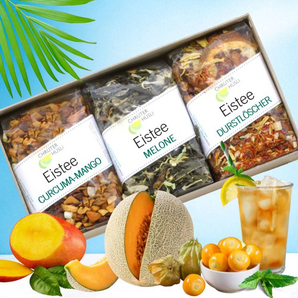 Die beliebtesten Eistees zum Ausprobieren. Dieses praktische Probiertrio umfasst unsere drei bestlaufenden Eistees aus unserem grossen Sortiment. Mit dem praktischen Probiertrio sorgen Sie für kühle Abwechslung an heissen Sommertagen! Sie kreieren selber leckere Eistees mit drei verschiedenen Geschmacksvariationen: Zubereitung: Alles drei Eistees können nach der trendigen "Cold-brew" Variante zubereitet werden. Dafür geben Sie ca. 2 EL Teemischung in 1 Liter kaltes Wasser und lassen die Mischung im Kühlschrank mind. 2 Stunden ziehen. Danach absieben, wenn gewünscht Zucker beifügen, oder direkt geniessen. Farblich und geschmacklich noch intensiver werden die Eistees, wenn Sie ca. 2 EL Eistee-Mischung mit ca. 1dl kochend heissem Wasser übergiessen und ca. 10 Min. ziehen lassen. Danach füllen Sie den Krug mit 9 dl kaltem Wasser auf und lassen die Mischung im Kühlschrank abkühlen.
