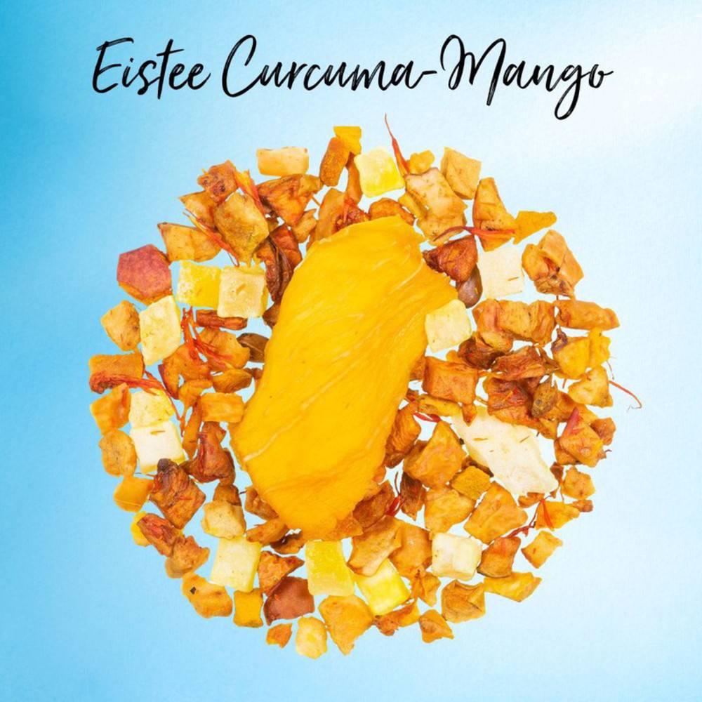 Eistee Durstlöscher 85g: kandierte Ananas, Apfel, kandierte Papaya, kandierte Mango, natürliches Aroma: Mango, Mandarine, Physalis, Saflor, Rosen, Sonnenblumenblüten. Eistee Melone 60g: Grüner Tee, kandierte Ananasstücke, natürliches Aroma: Melone, Apfelstücke, Nanaminze, Zitronenschale, Quinoa, Ringelblumenblüten, Galiamelonenstücke, Stevia. Eistee Curcuma-Mango 85g: Apfelstücke (Apfel, Säuerungsmittel: Zitronensäure), kandierte Mango (Mango, Zucker) (12%), Mango (8%), natürliches Aroma, Kurkuma, Bastardsafranblüten.