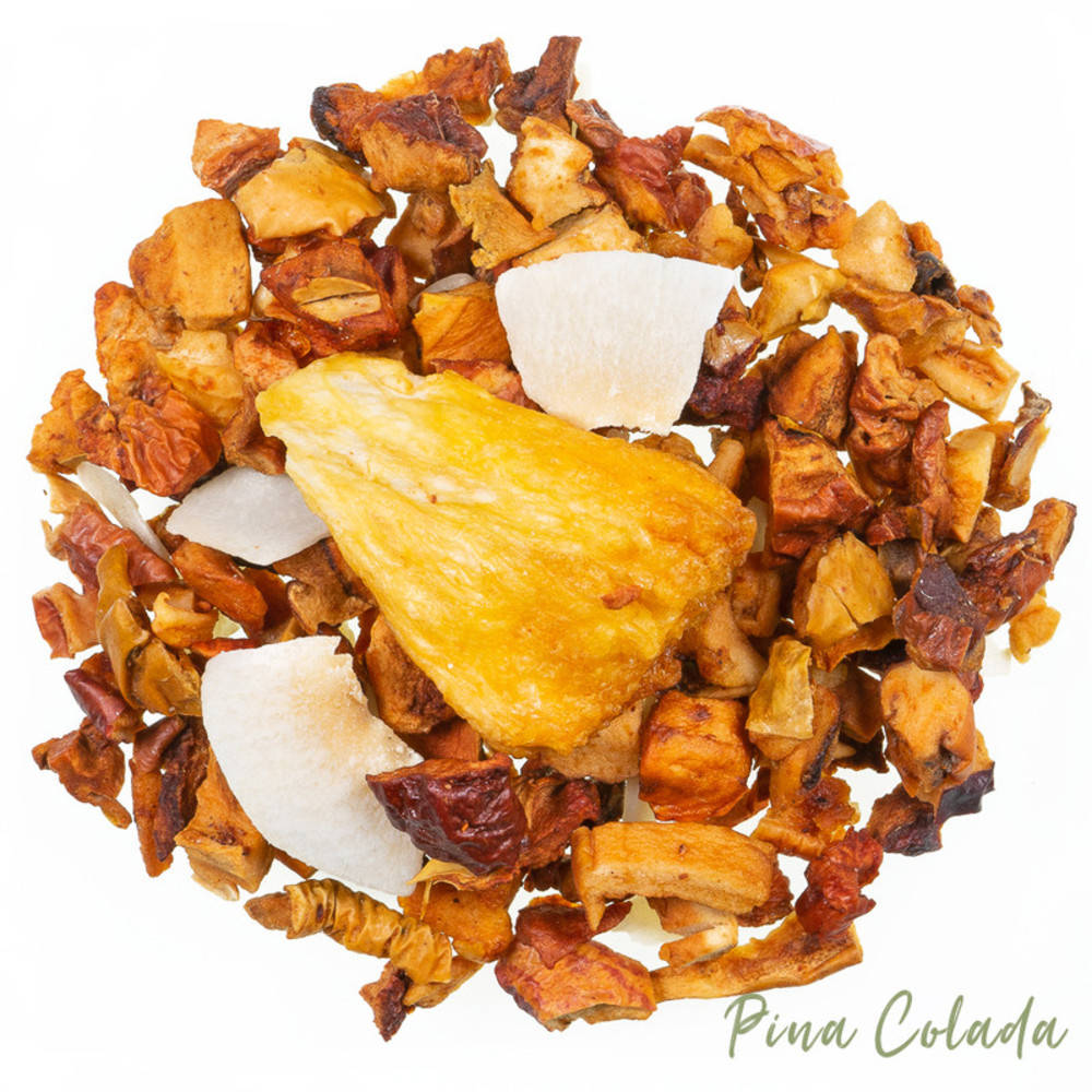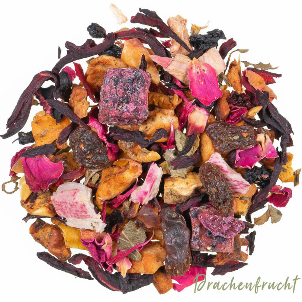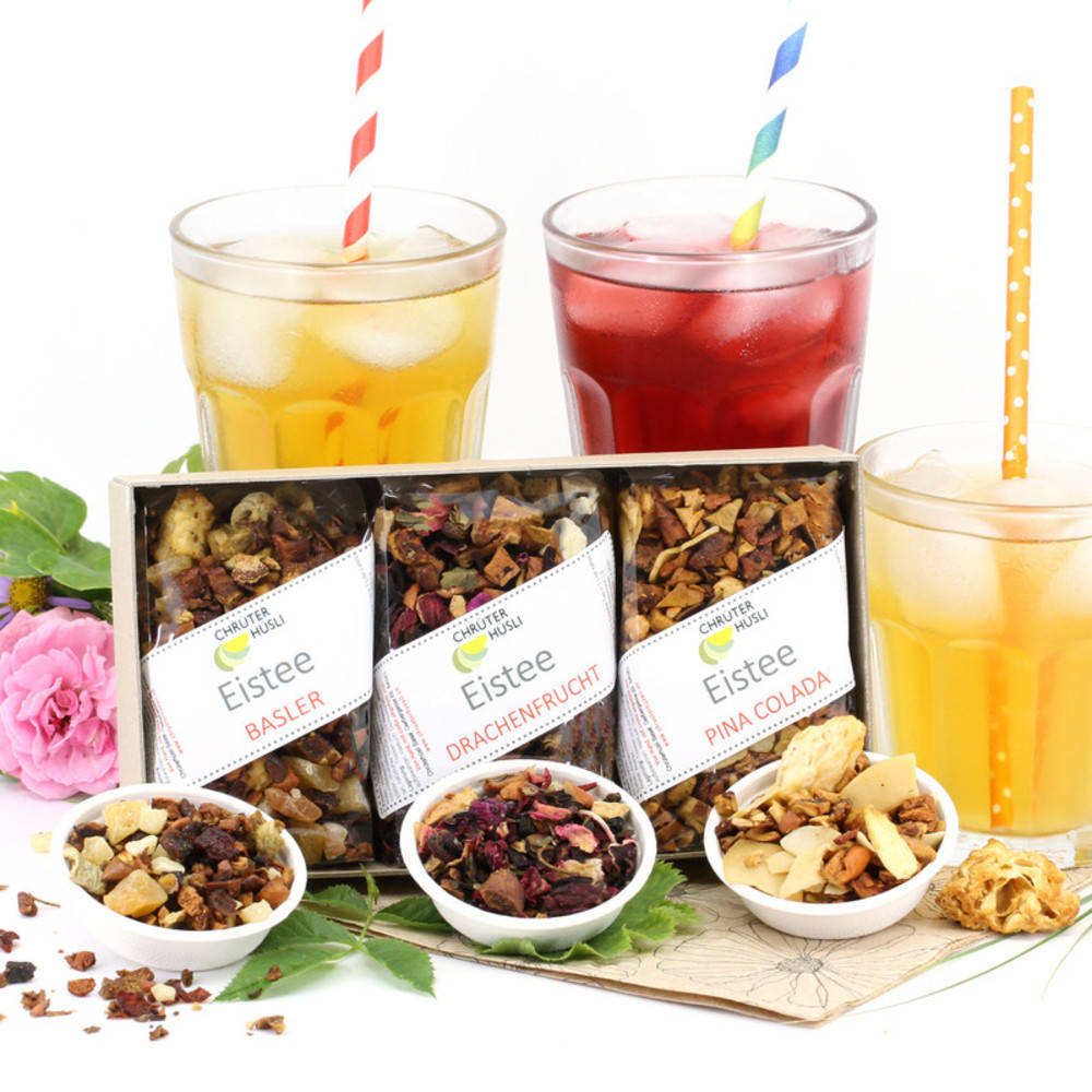 Basler Eistee 95g: Birnen, Apfel, Zitronensäure, kandierte Ananas (Zucker), kandierte Mango (Zucker), Galiamelone, Hagebuttenschale, Kiwistücke, natürliches Aroma: Kiwi. Drachenfrucht 70g: Apfelstücke, Zitronensäure, Hibiskusblüten, Weinbeeren, süsse Brombeerblätter, Holunderbeeren, Drachenfruchtstücke, Rosenblütenblätter, Rhabarberstücke, pinke Kornblumenblüten, natürliches Aroma: Drachenfrucht. Pina Colada 80g: Apfelstücke (Apfel, Säuerungsmittel: Zitronensäure), Kokoschips (Kokosnuss, Zucker), Ananaschips (10%), natürliches Aroma: Ananas.