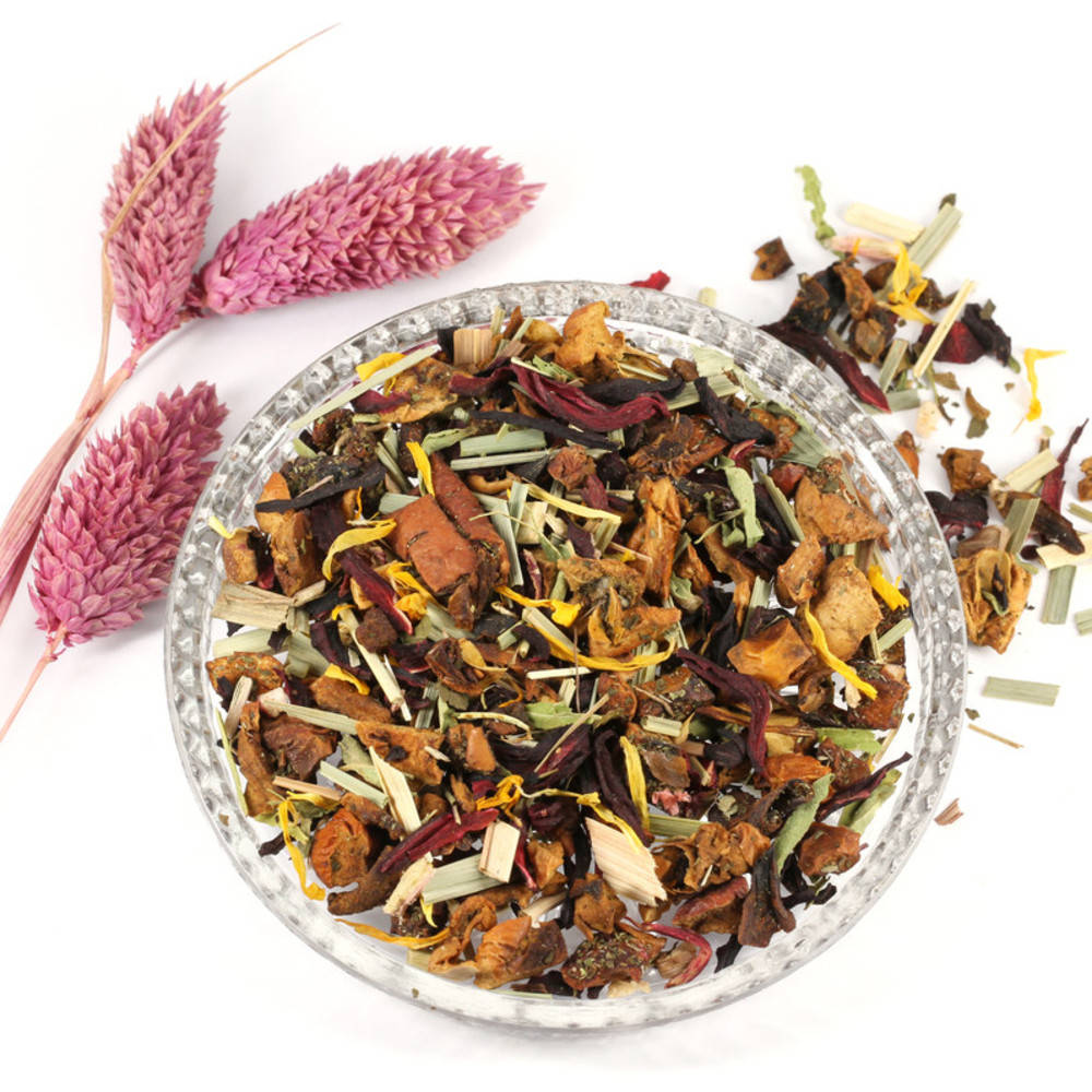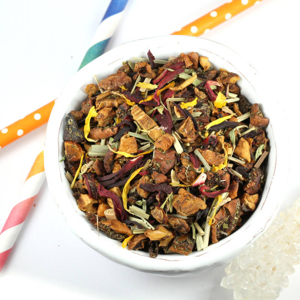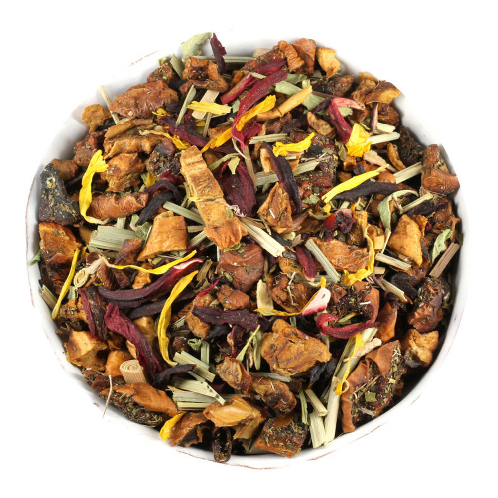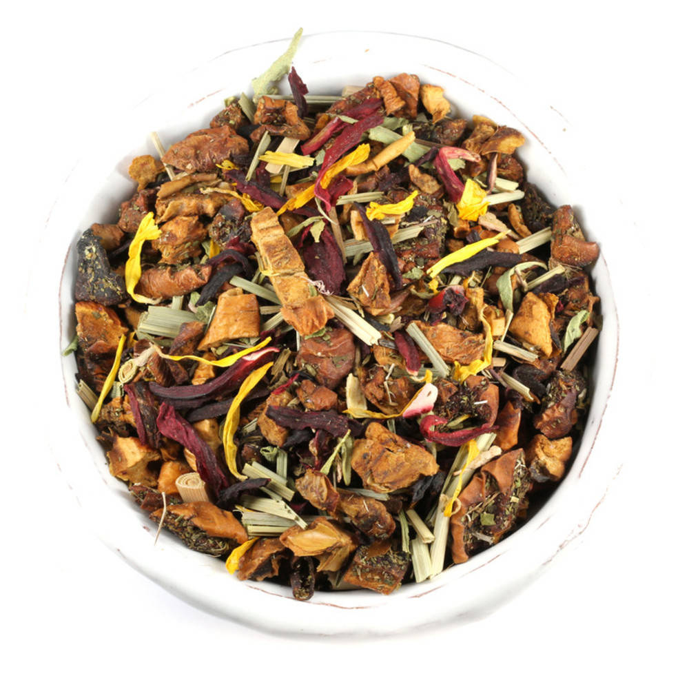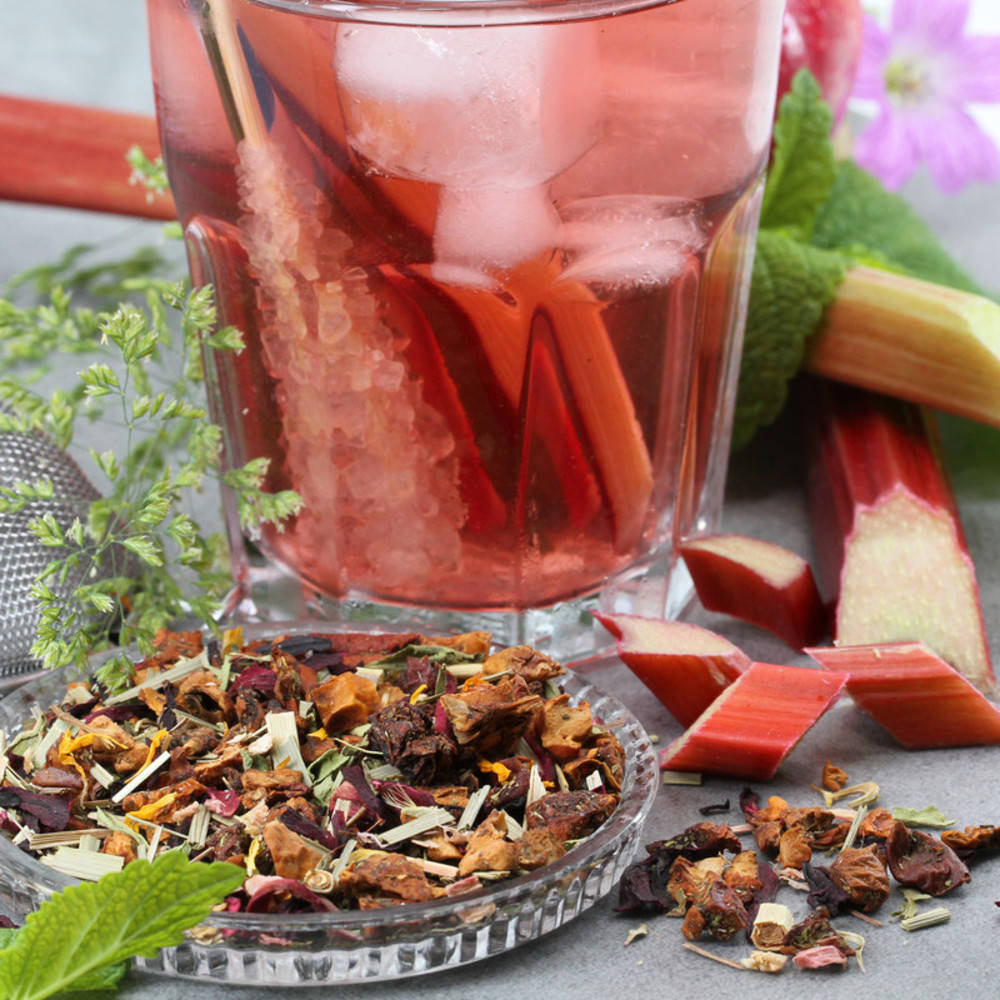Apfelstücke (Apfel*, Säuerungsmittel: Zitronensäure), Hibiskusblüten*, Lemongras*, natürliches Rhabarberaroma, Nanaminze*, Thymian*, Stevia*, Ringelblumenblüten*, Rhabarberstücke* (0.5%) *Kontrollstelle: CH-BIO-006