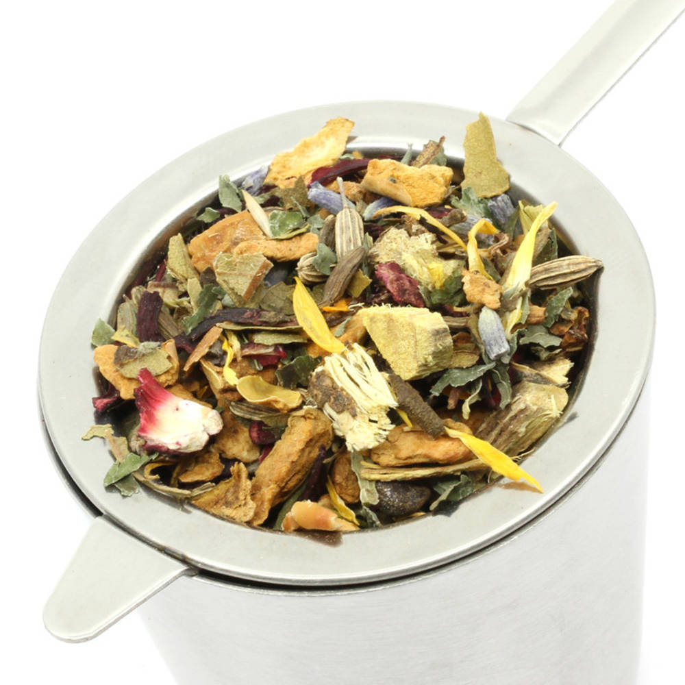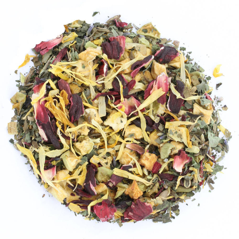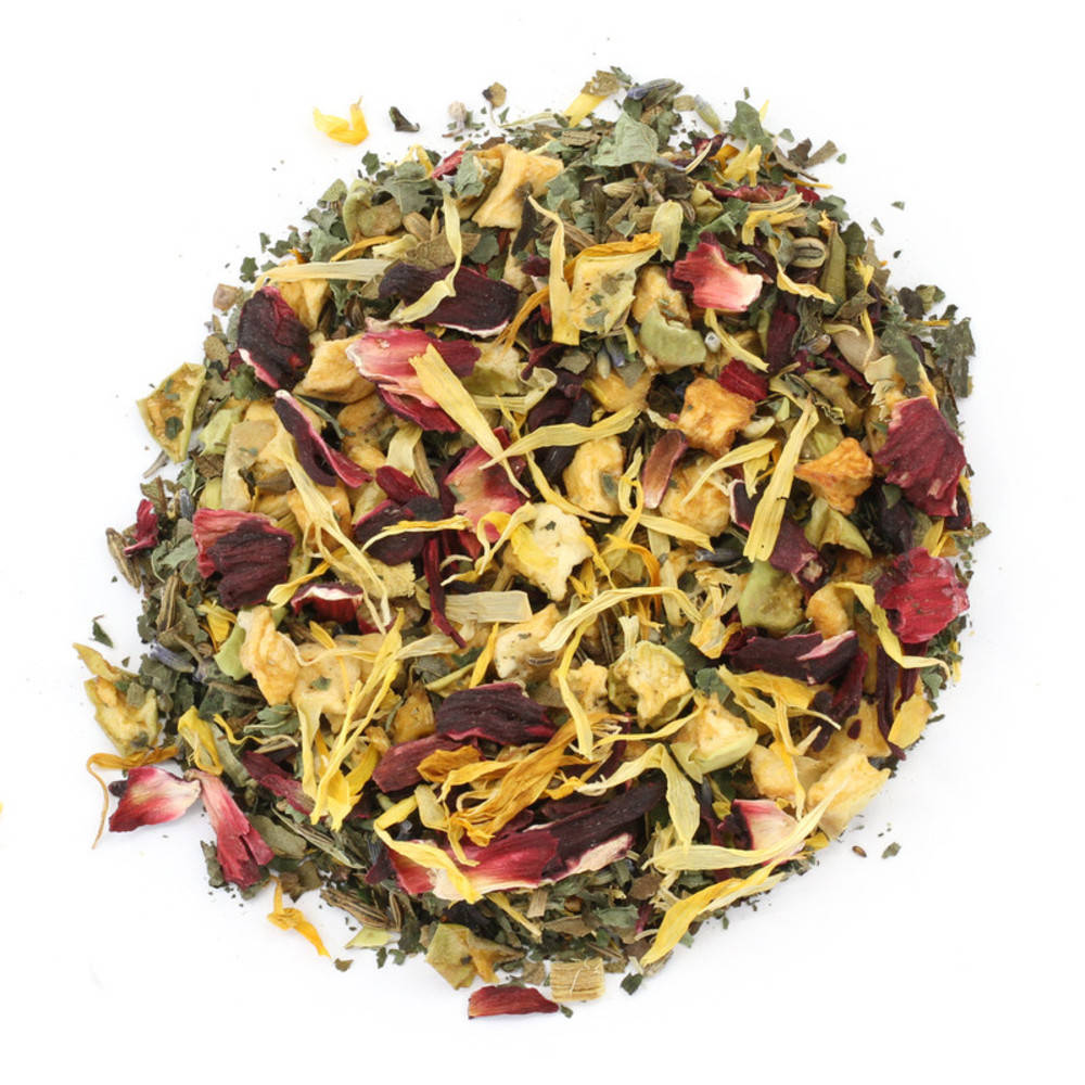 Apfelschalen Bio, Hibiskusblüten Bio, Orangenschale Bio, Zitronenmyrte Bio, Melisse Bio, Süssholz Bio, wilder Fenchel Bio, Kümmel Bio, Lavendel Bio, Ringelblume. Kontrollstelle: CH-BIO-006