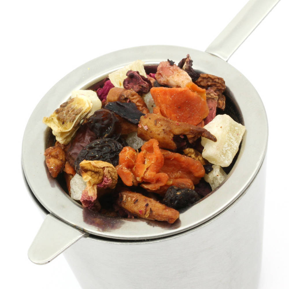 Apfel, Weinbeeren, Karotte, Hibiskus, Rande, natürliches Aroma: Granatapfel, kandierte Ananas (Zucker), kandierte Mango (Zucker), Papaya, Limone, Rosenblüten, Kiwi, Granatapfel.