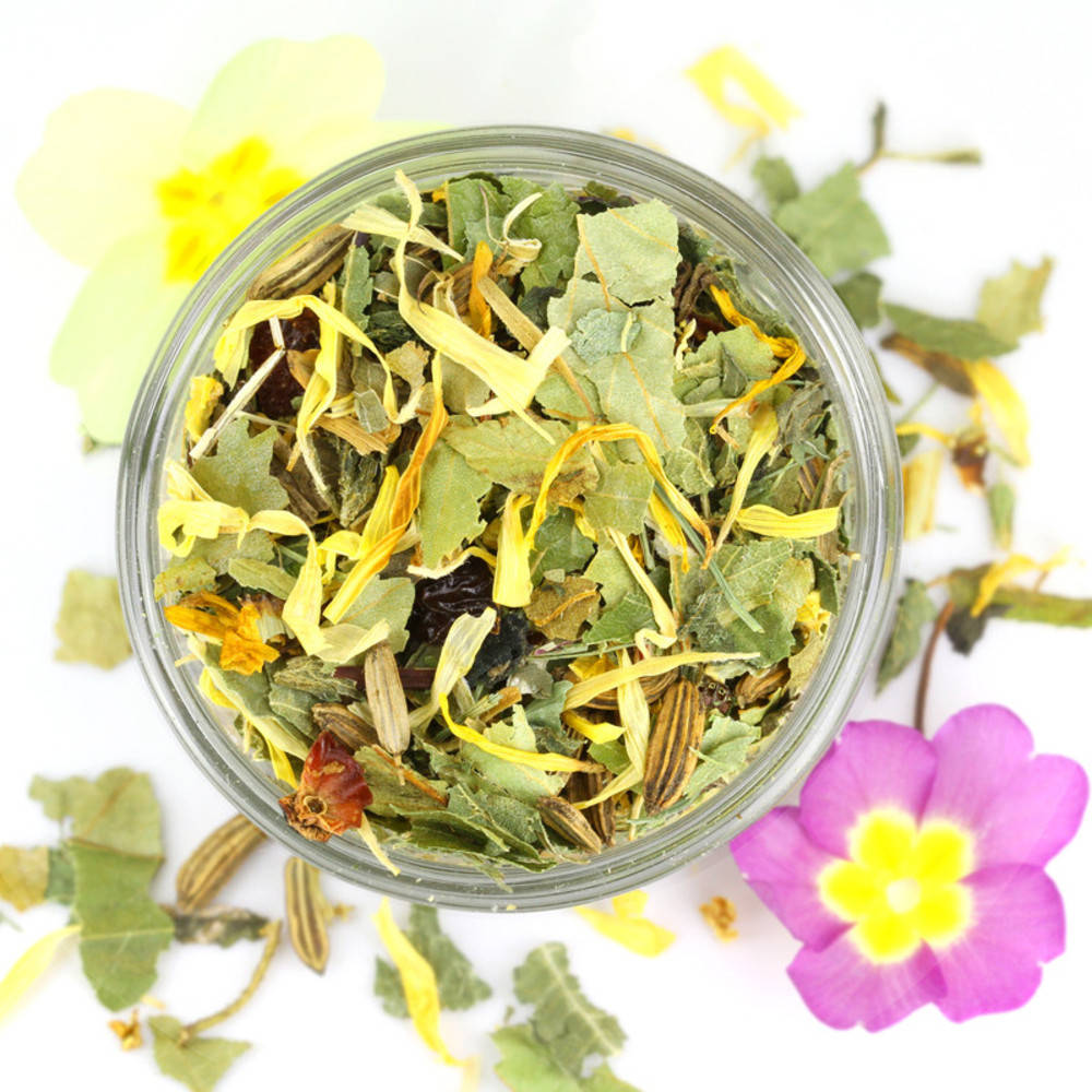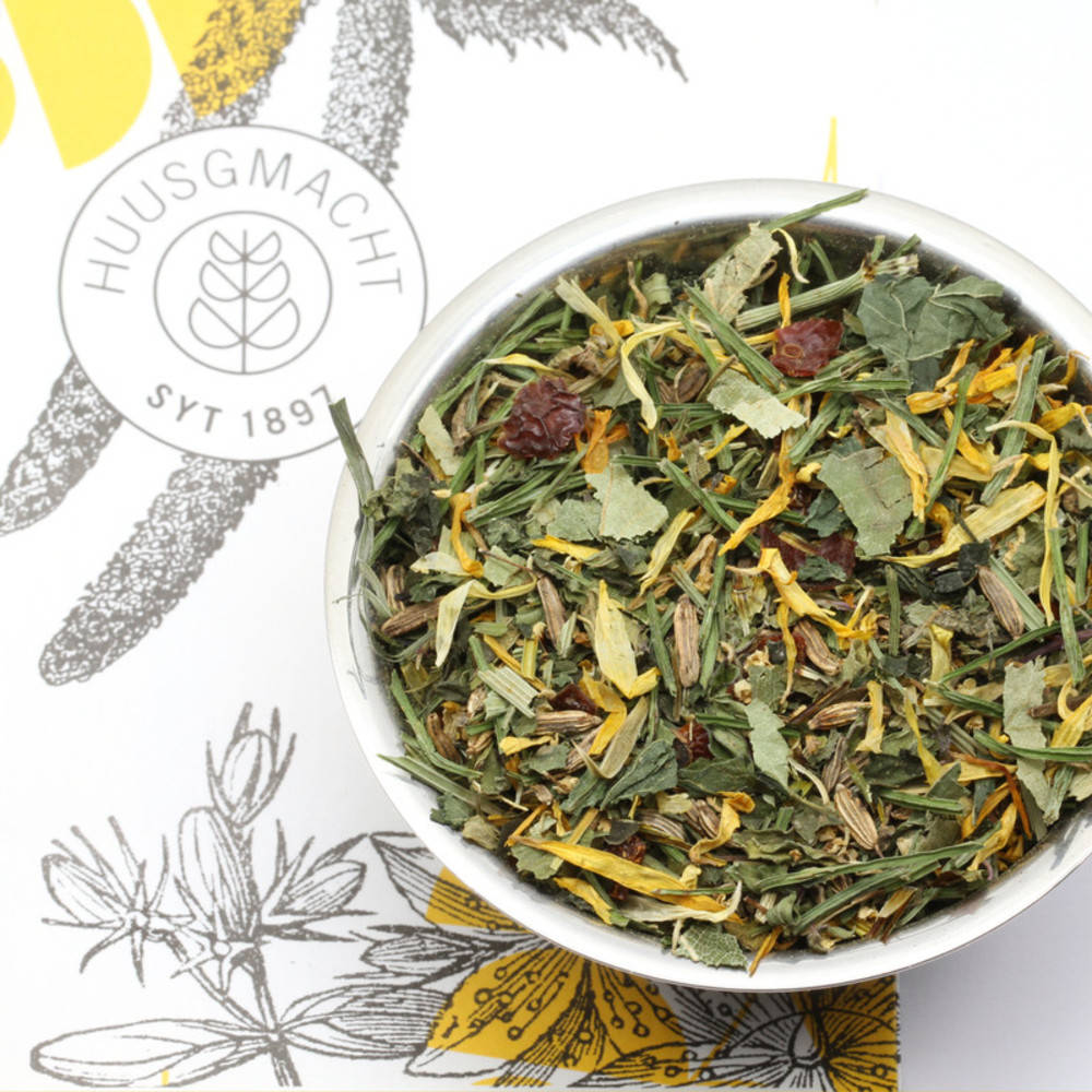 Brennnesselblätter*, Fenchelsamen wild*, Schachtelhalm*, Holunderblüten*, Birkenblätter*, Pfefferminzblätter*, Hagebuttenschalen*, Ringelblume*. *aus kontrolliert biologischer Landwirtschaft Zertifizierungsstelle: CH-BIO-006