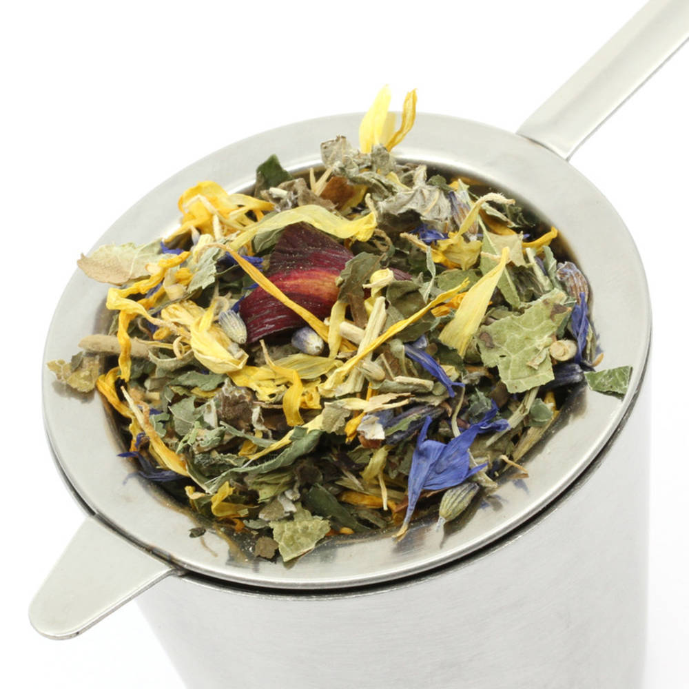 Melisse Bio*, Krauseminze, Orangenschale Bio*, Lavendel Bio*, Ringelblume Bio*, Himbeerblätter Bio*, Johannisbeerblätter Bio*, blaue Kornblume Bio*, Klatschmohn, Stevia Bio*. *81.9% der Zutaten landwirtschaftlichen Ursprungs stammen aus kontrolliert biologischer Landwirtschaft Kontrollstelle : CH-BIO-006