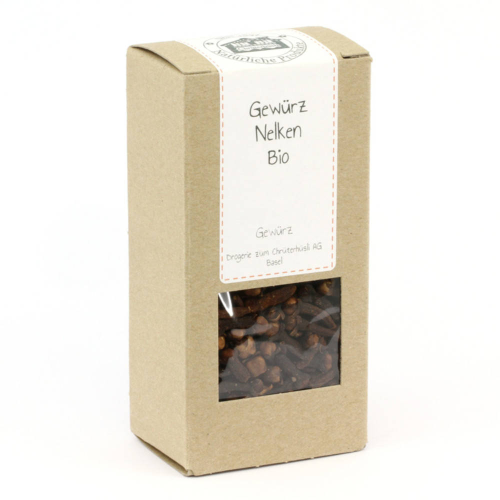 Die Gewürznelken, die nichts mit der hiesigen Gartennelke zu tun haben, sind die Blütenknospen eines immergrünen Baums aus der Familie der Myrthengewächse. Die dominierende Aromaverbindung in Gewürznelken ist Eugenol, welches eine betäubende Wirkung auf die Nerven ausübt. Dies reduziert für einige Zeit unsere Geschmacksempfindungen. Das ist mitunter ein Grund, weshalb die Nelken nur sparsam eingesetzt werden sollten. Die Duftnoten der Gewürznelke verflüchtigen sich während des Trocknens fast vollständig. Im Geschmack sind Gewürznelken leicht bitter, mitunter beissend. In gekochten oder geschmorten Gerichten werden die Gewürznelken am besten ganz oder grob gemörsert zugefügt, damit sich die ganzen Gewürznelken oder Bruchstücke zum Fertigstellen der Speisen gut entfernen lassen. In eine Zwiebel oder in ein Lorbeerblatt gesteckt klappt es am Besten. Die Gewürznelke bildet oft eine Brücke von Süssem und Pikantem, z.B. in Ragouts (Coq au vin), Rotkohl, Schweinefleisch und Wild.  Ebenso mildert die Nelke den süss-säuerlichen, adstringierenden Geschmack von Granatapfelsamen. Die Gewürznelke stammt aus Indonesien. Sie wurde allerdings schon im Altertum in Europa gehandelt und wurde von den Römern als Gewürz verwendet. Sparsam verwenden! Kontrollstelle.CH-BIO-006