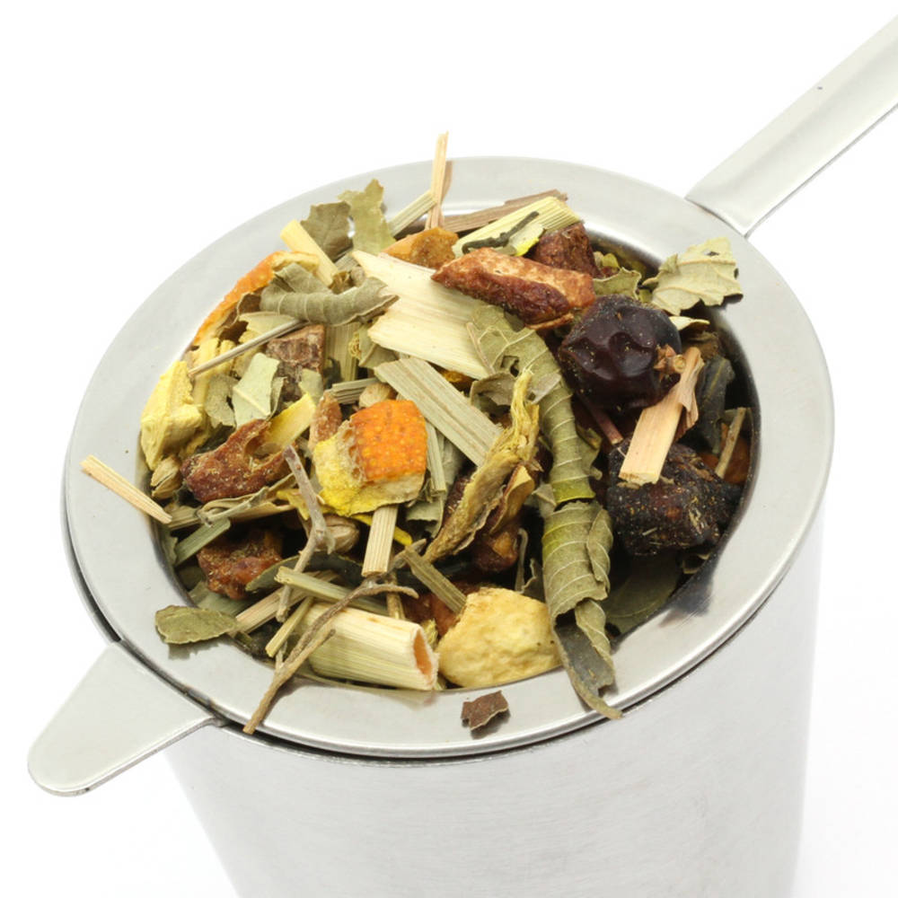 Apfelstücke, Lemongras, Süssholzwurzel, grüner Tee, Brombeerblätter, natürliches Aroma: Zitrone, Orangenschale, Ingwerstücke, Zimtrinde, Koriander, Wacholderbeeren, Kurkuma, Verbenenkraut, Zitronenschalen, rosa Pfeffer, Kardamom.