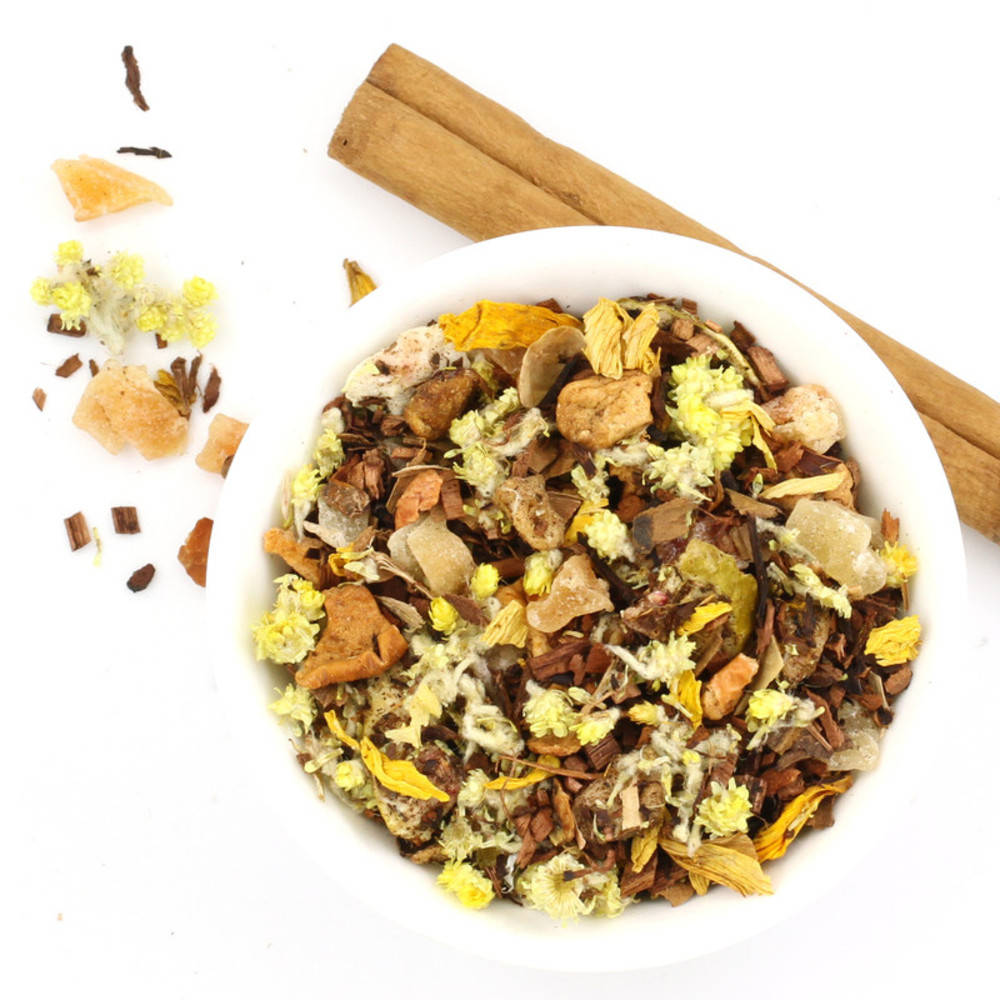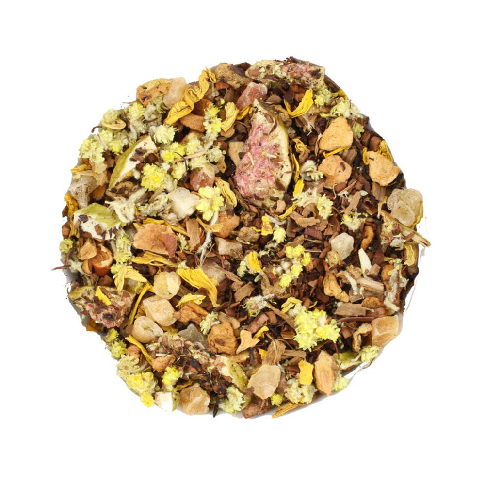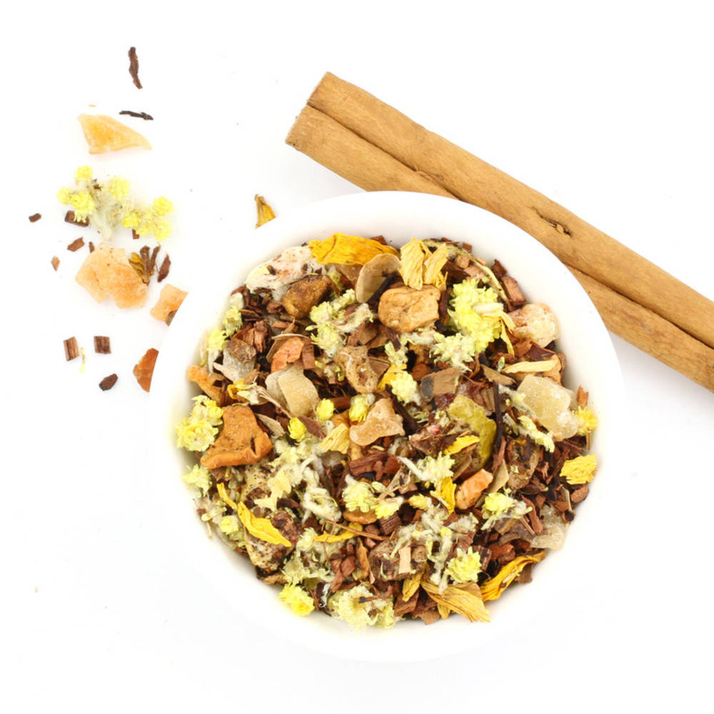 Honeybuschtee, Apfelstücke, Ananaswürfel (Ananas, Zucker), Papayawürfel (Papaya, Zucker), Zimtstangen, Zimtstücke, gefr.-getr. Feigenviertel, gefr.-getr. Litschistücke (Litschi, Zucker, Säuerungsmittel: Citronensäure), Sonnenblumenblüten, Katzenpfötchen, natürliches Aroma: Honig.