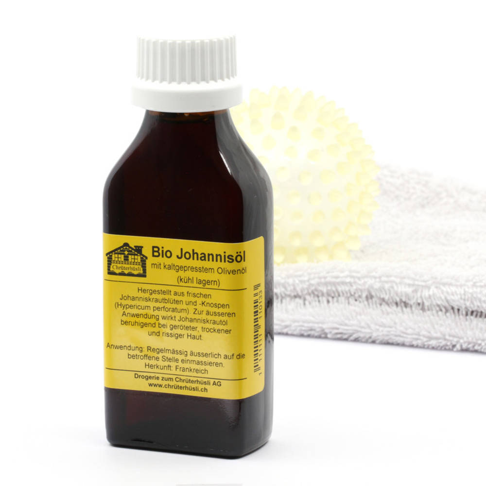 Kaltgepresstes Olivenöl Kaltmazerat mit Hypericum perforatum Blüten und Knospen.