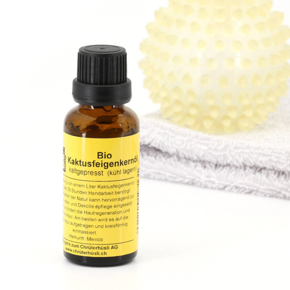 Das Kaktusfeigenkernöl Bio wirkt wunderbar gegen Falten. Die Haut wird zart und geschmeidig. Es ist auch sehr wirksam bei der Milderung von Narben. Es fördert die Hautregeneration, wirkt straffend und durchblutungsfördernd. Unser Kaktusfeigenkernöl Bio ist 100% rein und kaltgepresst, nicht desodorisiert und nicht raffiniert. Es wird mit Hilfe eines sehr aufwendigen Verfahrens gewonnen. Um einen Liter Kaktusfeigenkernöl zu gewinnen, müssen über 30 Stunden Handarbeit und ungefähr 1 Million Kaktusfeigenkerne eingesetzt werden. Kontrollstelle:CH-BIO-006