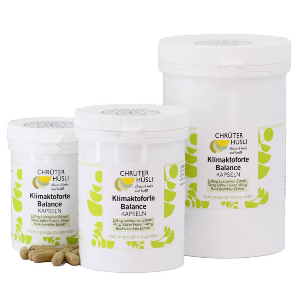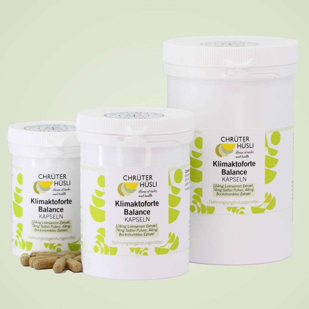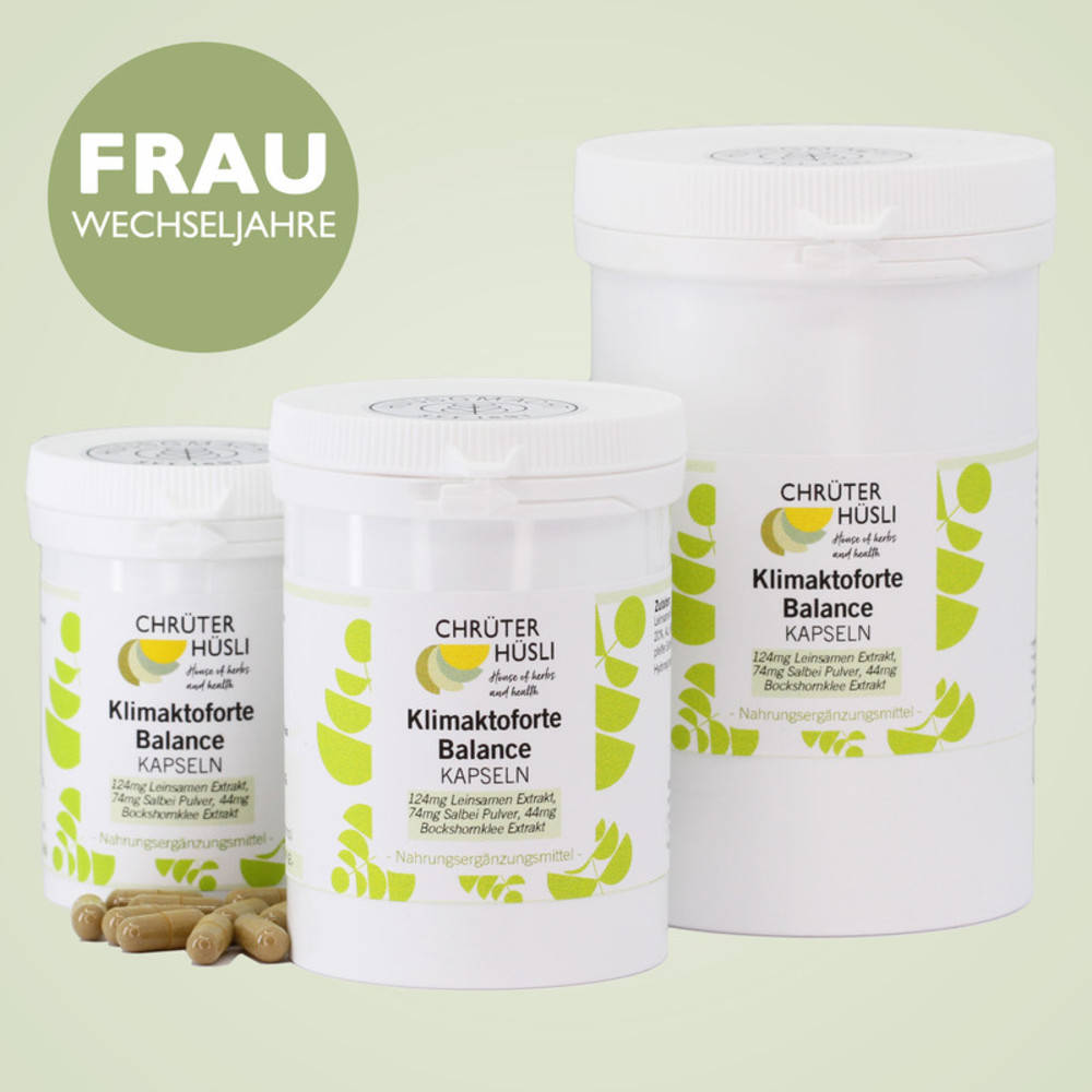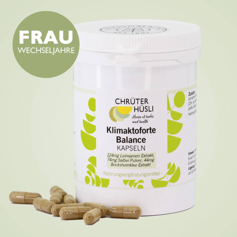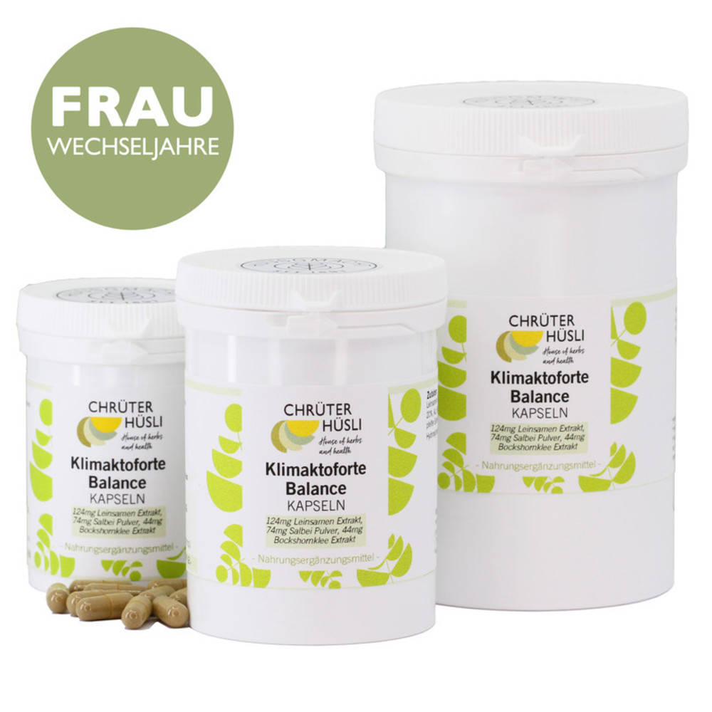 Natürlich und entspannt durch die Wandeljahre Das bewährte, pflanzliche Nahrungsergänzungsmittel für die Wechseljahre – hergestellt im Chrüterhüsli nach eigenem Rezept. Das einzigartige, pflanzliche Komplexmittel begeistert durch seine hervorragende Verträglichkeit und seinen wohltuenden Effekt während den Wandeljahren. Im Chrüterhüsli Nahrungsergänzungsmittel Klimaktoforte Balance haben wir 5 Pflanzen zusammen kombiniert, welche miteinander gut harmonieren und sich gegenseitig sinnvoll ergänzen (Bockshornklee, Leinsamen, Mönchspfeffer, griechischer Salbei und Safran). Das Klimaktoforte Balance moduliert den Hormonhaushalt während den Wandeljahren und sorgt für Ausgeglichenheit und Wohlbefinden. Porträt der einzelnen Pflanzen: Bockshornkleesamen Extrakt - Trigonella foenum-graecum Das einjährige, 10 bis 50cm hohe Kraut, ist im gesamten Mittelmeerraum und in Vorderasien beheimatet. Die Samen werden im Nahen Osten und in Afrika als Küchengewürz eingesetzt. Sowohl Hildegard von Bingen wie auch Sebastian Kneipp schätzten die Pflanze in hohem Mass. Bockshornkleesamen enthalten neben Lecithin und Vitamin D auch Steroidsaponine, unter anderem Diosgenin. Diosgenin ist ein Phytoprogesteron. Leinsamenextrakt - Linum usitatissimum Leinsamen sind hellbraune bis rötlichbraune Samen, welche aus der reifen Frucht des (Saat-)Leins oder des Flachs (Linum usitatissimum) gewonnen werden. Leinsamen enthalten eine Vielzahl gesundheitsfördernder Inhaltsstoffe wie Omega-3 Fettsäuren, Ballaststoffe, Antioxidantien und Lignane. Lignane gehören zu den Phytoöstrogenen und begünstigen die natürliche Balance im Östrogenhaushalt. Salbei - (Salvia triloba) Salbei ist die bekannteste Pflanze, um die Schweissproduktion zu regulieren. Sie enthält neben Gerbstoffen und Steroide vor allem ätherische Öle. Es gibt viele verschiedene Salbeisorten, welche alle einen ähnlichen Einfluss auf die Schweissproduktion haben, jedoch auch grosse Unterschiede in der Zusammensetzung der Inhaltstoffe aufweisen. So sollte der «Griechische Salbei» (Salvia triloba) dem «Echten Salbei» oder «Garten-Salbei» (Salvia officinalis) vorgezogen werden, denn der Garten-Salbei enthält grössere Mengen Thujon, ein Nervengift. Mönchspfeffer - Vitex agnus-castus Der Strauch aus der Familie der Eisenkrautgewächse bildet kerzenartige Blütentrauben, aus denen im Herbst pfefferkorngrosse, dunkelbraune Früchte mit pfeffrigem Geschmack reifen. Diese Früchte haben eine ausgleichende Funktion auf den gesamten Hormonhaushalt (Progesteron, Dopamin, Prolaktin). Safran – Crocus sativus Die kleine, mehrjährige Pflanze mit ihren pastell-violetten Blüten gilt als das Gold der geistigen Gesundheit. Jeder Safrankrokus bildet bis zu vier Blüten mit jeweils einem gelben Griffel, der sich zu drei orangefarbenen bis roten Stempelfäden verzweigt – den Safranfäden. Ein Extrakt aus den Safranblüten vermag die natürliche Funktion des Nervensystems zu fördern und das Wohlbefinden und die Stimmung zu modulieren.