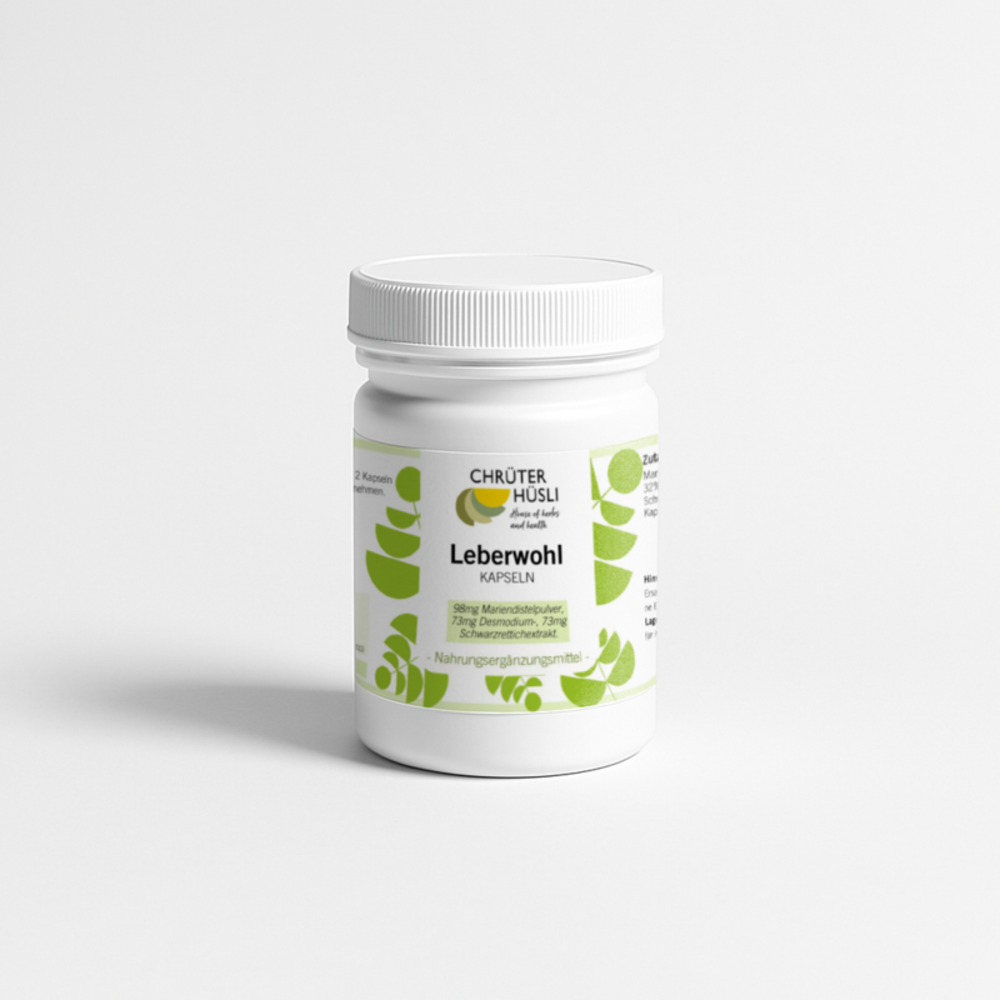 Für Zeiten, in denen Ihre Leber besondere Aufmerksamkeit verdient: Leberwohl Kapseln vereinen bewährte Pflanzenextrakte wie Mariendistel, Desmodium und Schwarzrettich – eine harmonische Kombination, die Ihre natürliche Leberfunktion gezielt begleitet. Funktionen im Fokus Leberfunktion Stoffwechsel Wohlbefinden Warum du sie lieben wirst • Mit Mariendistel – traditionell geschätzt für die natürliche Leberfunktion • Mit Desmodium – ideal zur Regeneration und Balance • Mit Schwarzrettich – unterstützt die natürliche Entgiftungsleistung Warum Chrüterhüsli? 🌿 Hausgemacht in kleinen Chargen 🌿 100 % Reinstoffqualität – ohne unnötige Zusätze 🌿 Jahrhundertaltes Pflanzenwissen in jedem Produkt
