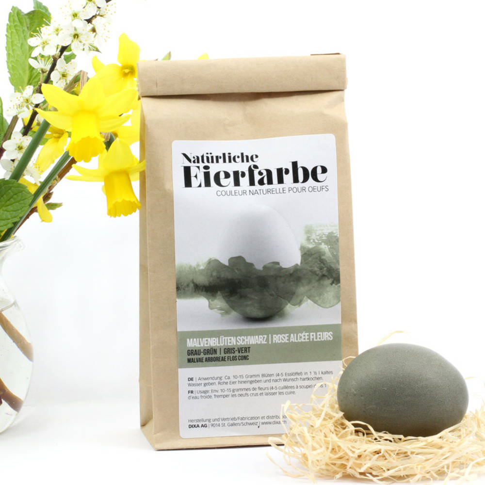 Mit den Blüten der Stockrose bzw. schwarzen Malve färben Sie die Eier natürlich in einer edlen dunkelgrünen bis grau-blauen Farbe. Die schwarze Malve (Althaea rosea) ist nicht zu verwechseln mit der wilden Malve (Malvae silvestris), welche in getrocknetem Zustand deutlich als blaue Blüte erkennbar ist. Frohe Ostern!