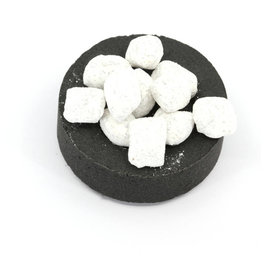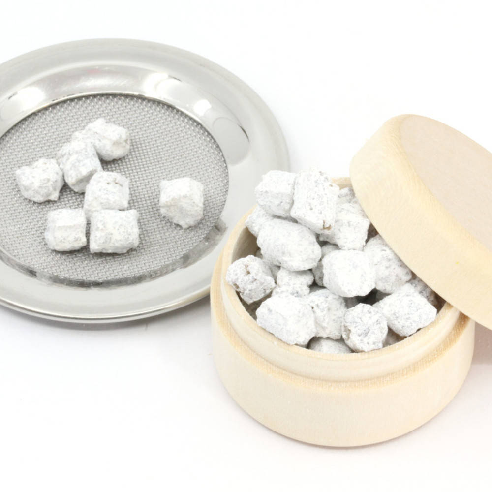 Es handelt sich um Myrrhe, die mit viel Aufmerksamkeit und Liebe in einem griechischen Kloster von Hand hergestellt und gleichzeitig durch Gebete geweiht wird. Der weisse Talk verhindert das Zusammenkleben der gesegneten Myrrhe.