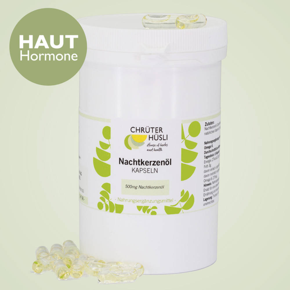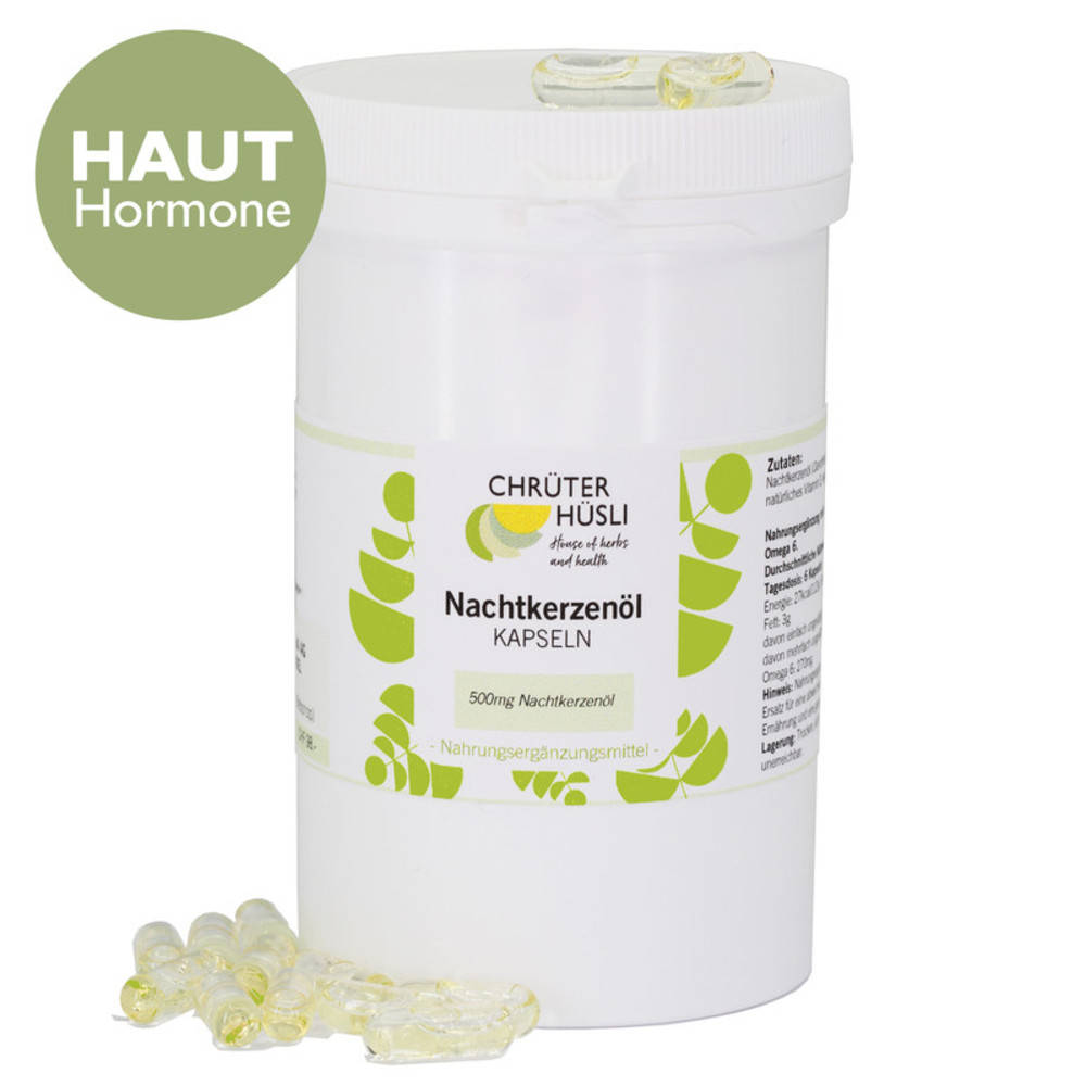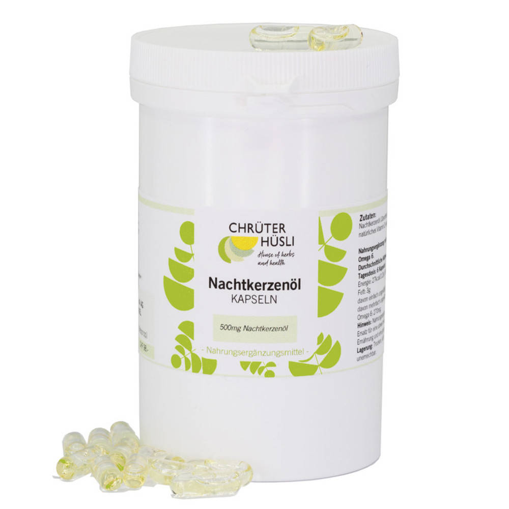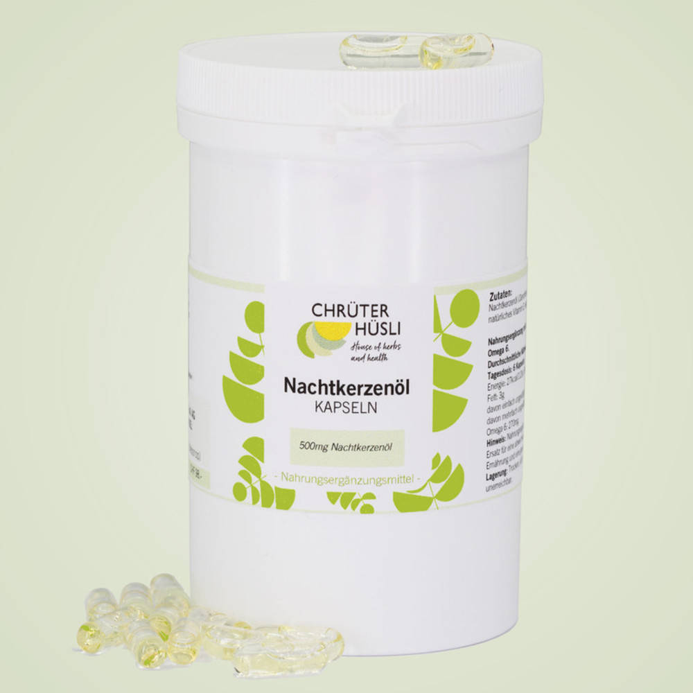 500mg Nachtkerzenöl (Oenothera biennis); Antioxidans: natürliches Vitamin E; vegetabile Kapsel: Hypromellose