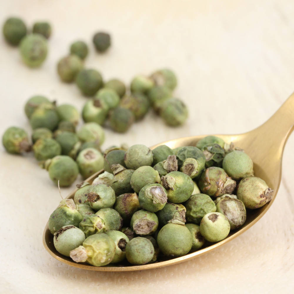 Dieser Pfeffer wird auf Vulkanerde aufgezogen. Vor Erreichen der vollen Reife wird er noch grün, von Hand geerntet und gefriergetrocknet um das volle Aroma zu erhalten.