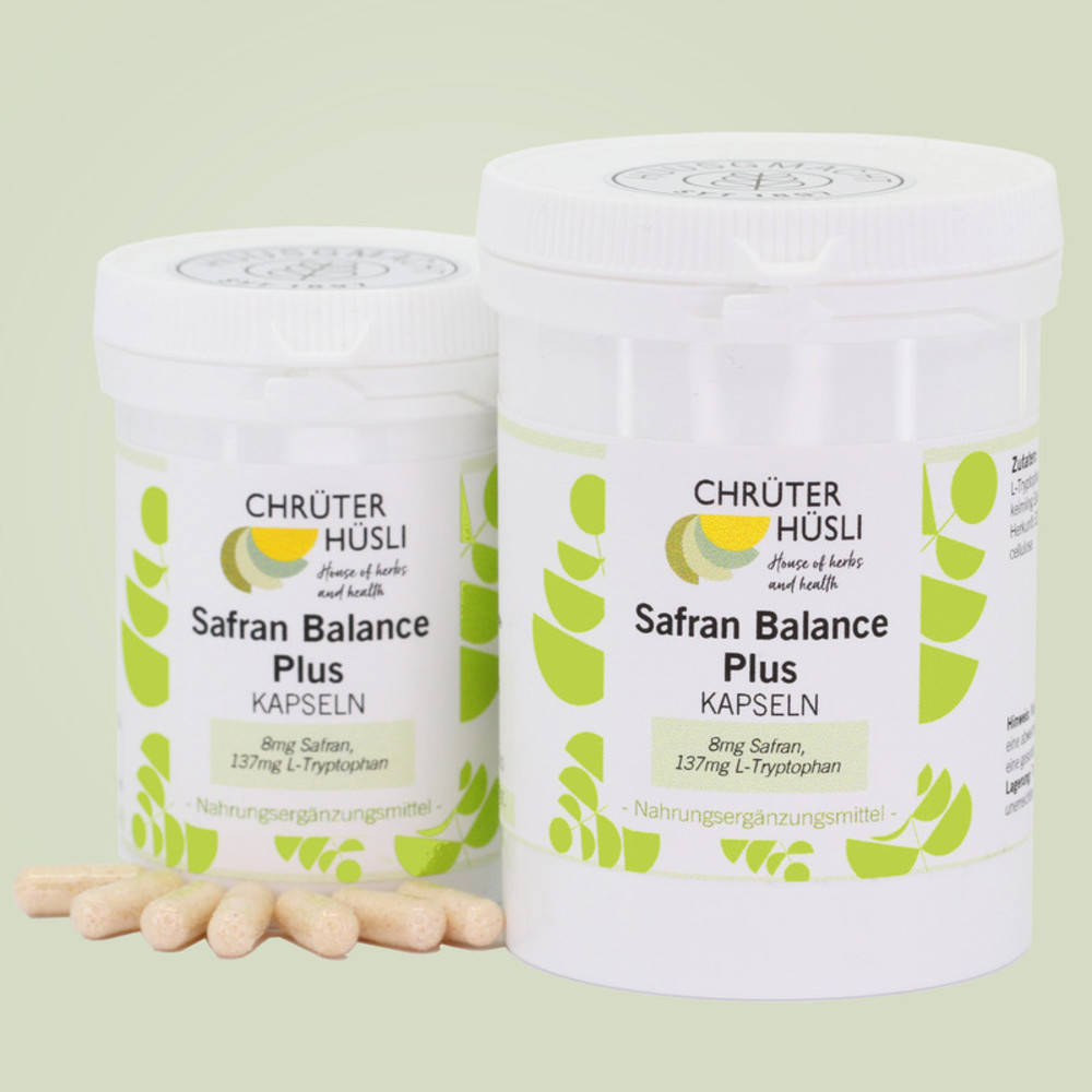 Unsere Neuheit, eine hauseigene und sinnvolle Rezeptur für eine gute Laune und zur Erhaltung einer normalen Funktion des Nervensystems und der Psyche. (Frühere Bezeichnung: Mood Balance Plus Kapseln) Neben der regelmässigen Bewegung und einem erholsamen Schlaf ist es für die gute Laune wichtig, bestimmte Nährstoffe, Vitamine und Mineralien in genügender Menge zu sich zu nehmen. Beispielsweise wird das Glückshormon Serotonin im Körper mit Hilfe der Aminosäure L-Tryptophan gebildet. Und ebenso führt ein Mangel an Folsäure und Vitamin B12 zu einer Senkung des Serotoninspiegels, während ein genügendes physiologisches Vorkommen der Vitamine B3 und B6 unerlässlich ist, damit L-Tryptophan zu 5-HTP respektive zu Serotonin und Melatonin umgewandelt werden kann. Das mag alles etwas kompliziert klingen - kann aber einfach erklärt werden: Würden wir uns alle maximal ausgewogen ernähren, bewegen und schlafen, dann wären wir mit grosser Wahrscheinlichkeit jederzeit glücklich und kerngesund. Leider ist dies erfahrungsgemäss nicht ganz so einfach. Der Schlüssel für eine gute Laune ist das Zusammenspiel diverser Elemente: Vitamin B, B2, B3, B5, B6, Biotin, Folsäure, B12 und L-Tryptophan. Alle diese Vitamine und Aminosäuren sind in unserer Hausspezialität "Safran Balance plus" natürlich enthalten. Zudem unterstützt ein kostbarer Safranblüten-Extrakt den stimmungsaufhellenden Effekt. Die kleine, mehrjährige Pflanze mit ihren pastell-violetten Blüten gilt als das Gold der geistigen Gesundheit. Safran ist seit tausenden von Jahren bekannt für seine stimmungsaufhellende und nervenstärkende Wirkung. Unsere 5 Gute Laune Tipps: Sinnvolle Ergänzungspräparate zu Safran Balance plus Kapseln: Detaillierte Informationen zu diesem Produkt finden Sie auf unserem Infoflyer.