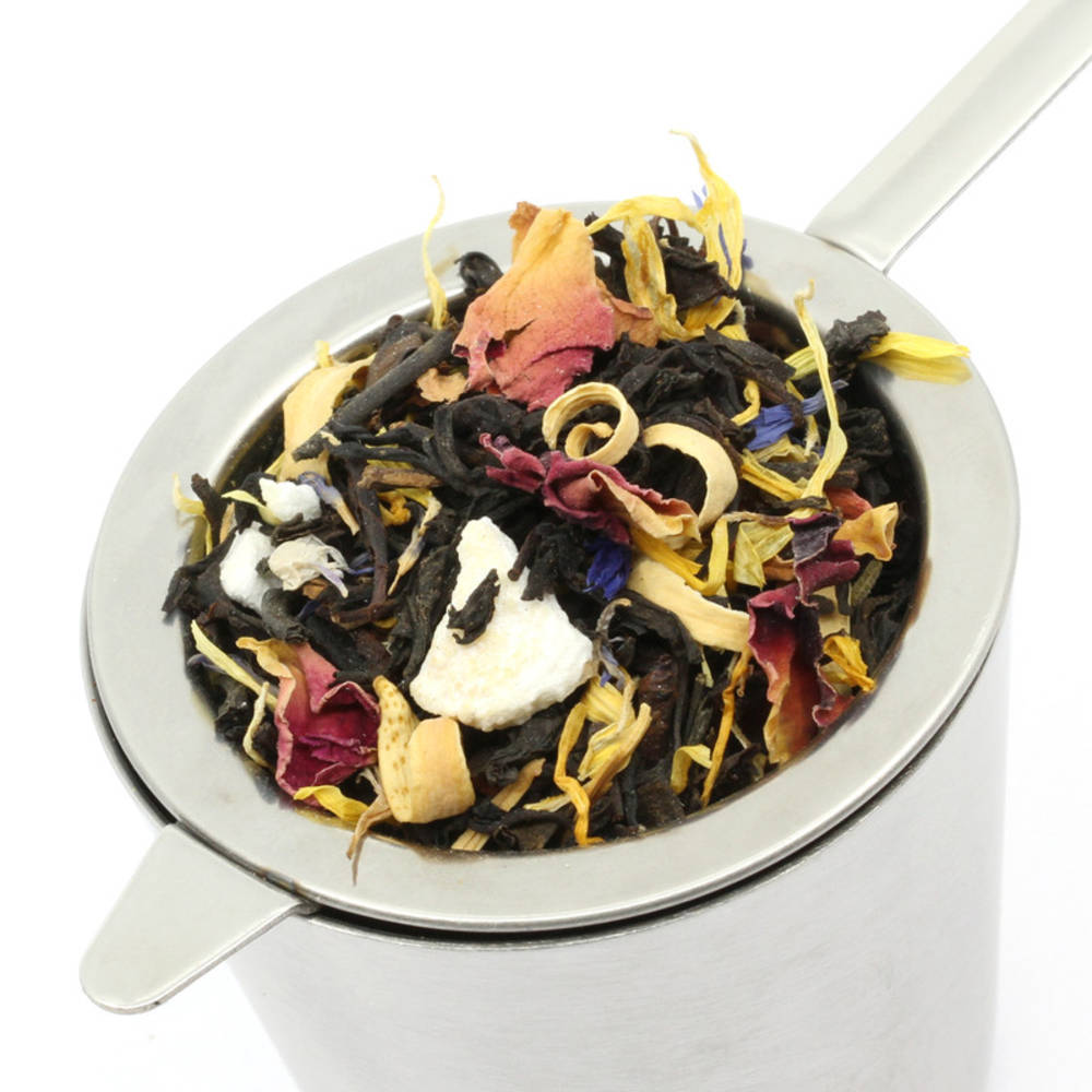 Schwarztee, Manna, Orangenblüten Bio, Ringelblumen Bio, Kornblumen blau Bio, natürliches Aroma: Mango, Maracuja, Pfirsich. Kontrollstelle: CH-BIO-006