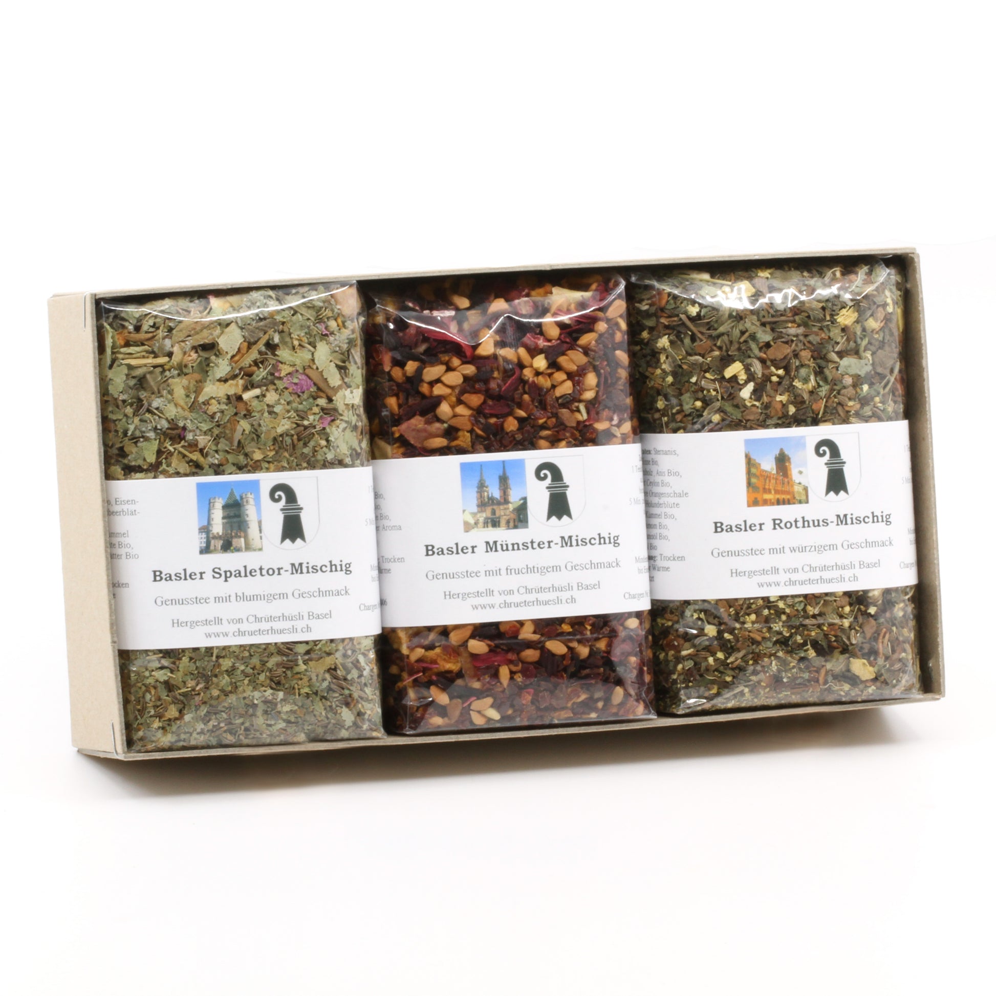 Die Basler Tee Trio Geschenkpackung vereint drei sorgfältig komponierte Kräuter- und Früchtetees, inspiriert von den bekanntesten Wahrzeichen der Stadt Basel. Eine harmonische Auswahl für Teeliebhaber:innen oder als stilvolles Geschenk.