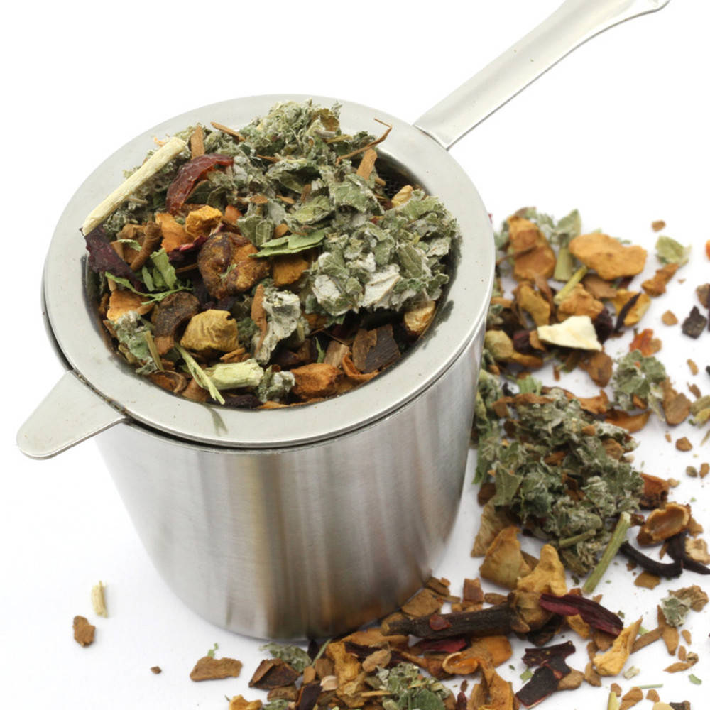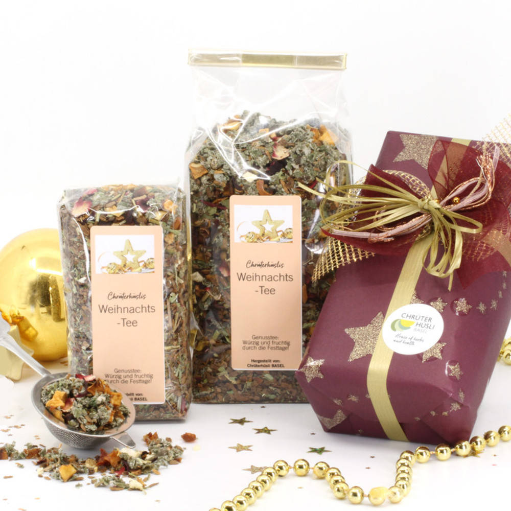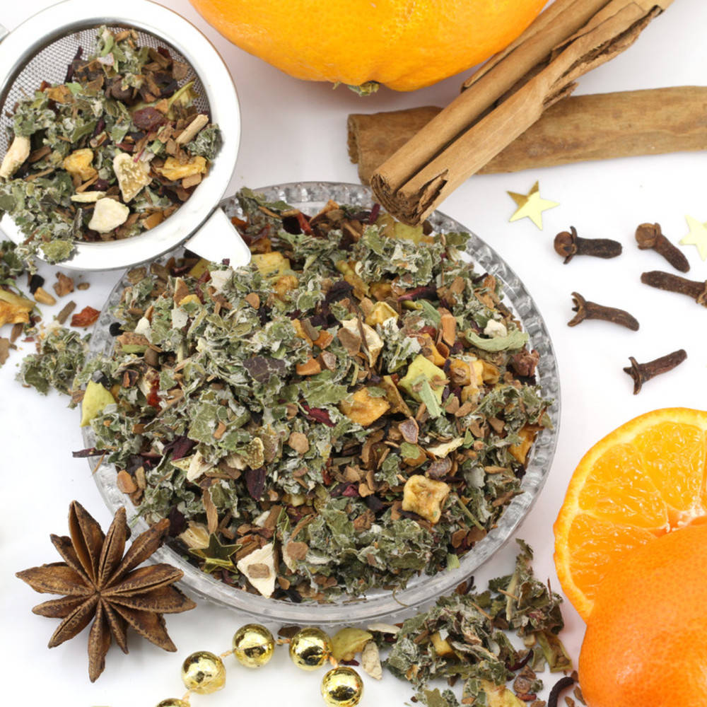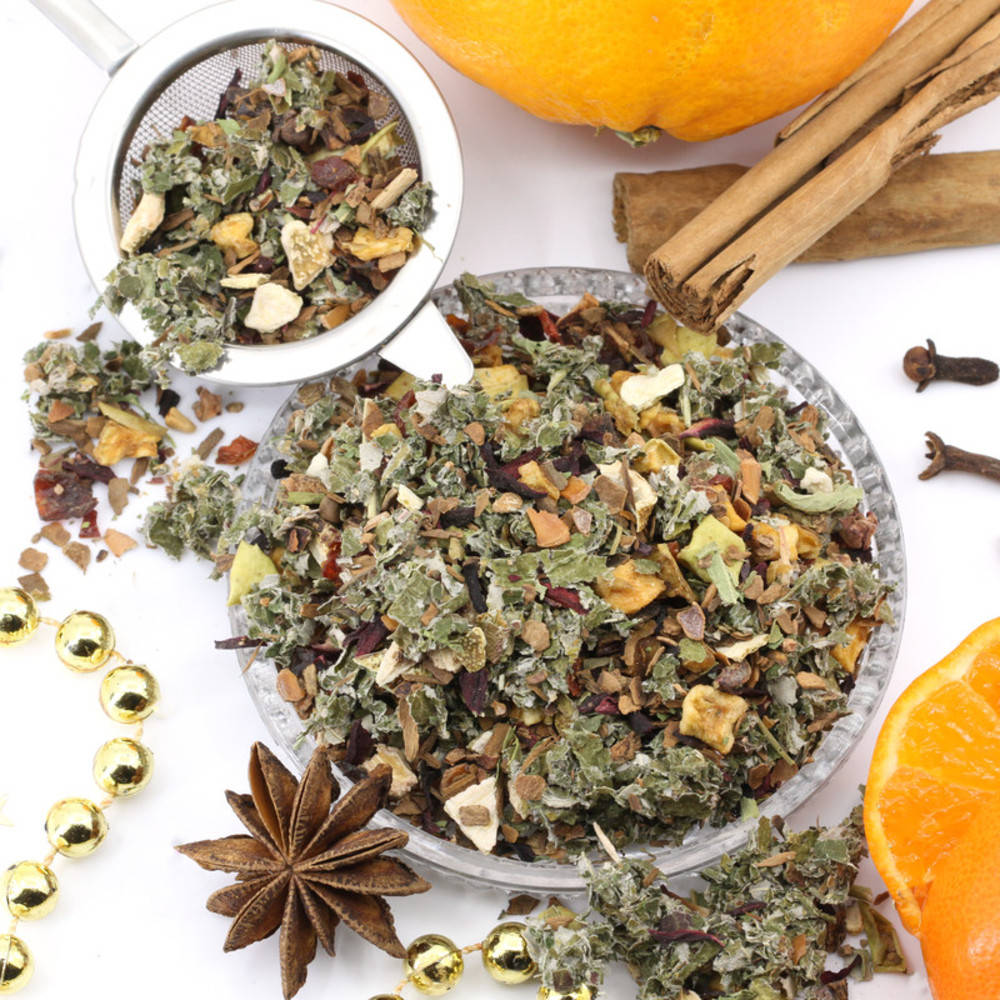Seit Jahren ist unser traditioneller Weihnachtstee ein Renner. Eine würzig-fruchtig-grüne Kräutertasse verleiht den dunklen Adventstagen und dem Weihnachtsabend eine festliche Stimmung. Zimt, Sternanis, Gewürznelken und Orangenschalenduft aus der Tasse dürfen nicht fehlen. Diese Teemischung mag die ganze Familie. Wenn Sie dem Tee einen Hauch von Zucker beigeben, wird der Geschmack der Gewürze und Früchte noch intensiviert!